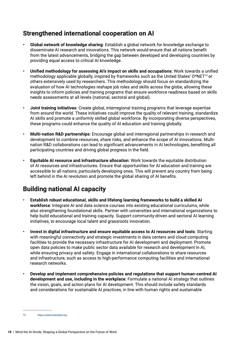 报告呼吁全球合作努力进行AI治理,维护人类尊严和劳工标准,为所有人扩大经济机遇,为全球共同繁荣和人类进步创造机会。