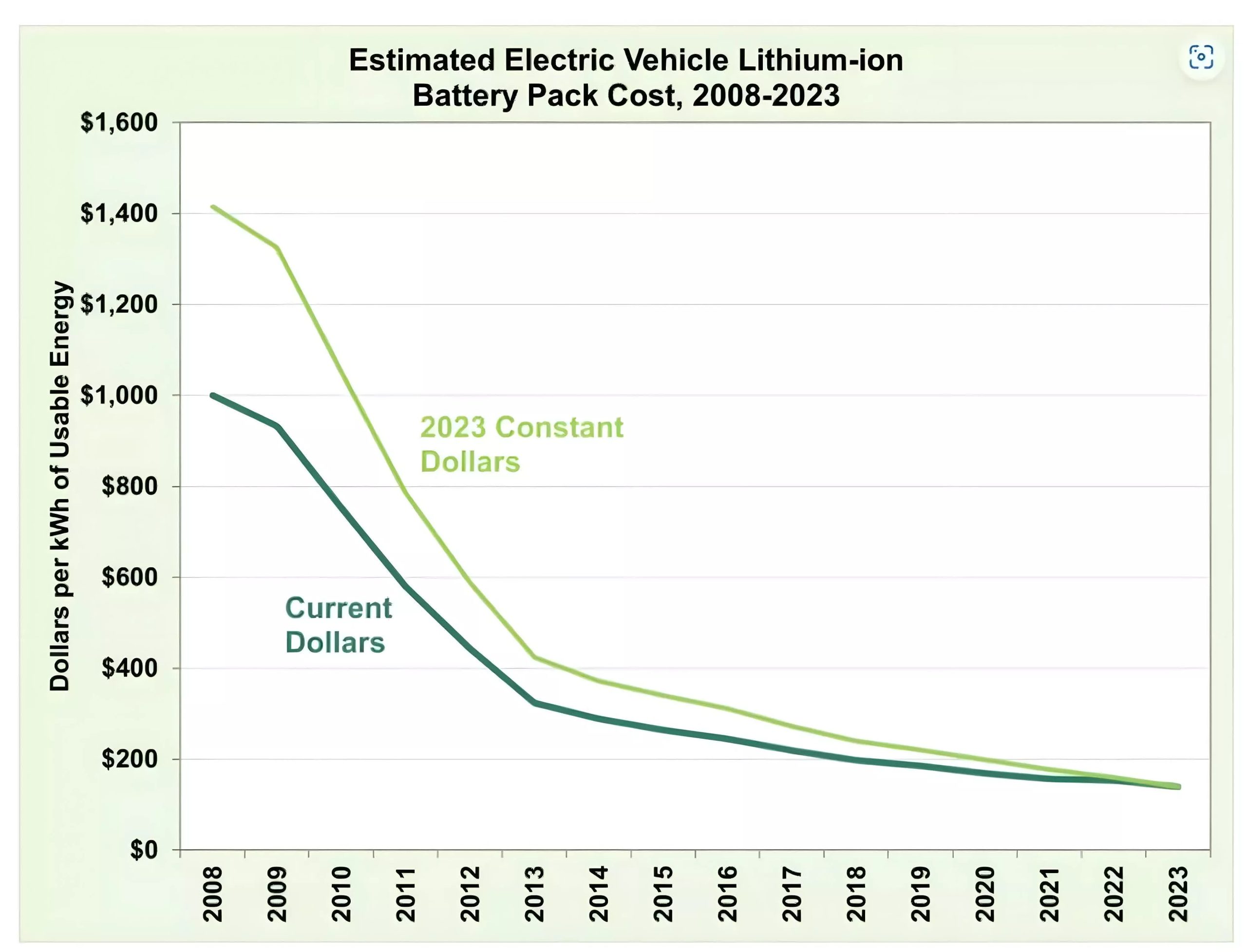 根据能源部车辆技术办公室的数据,从 2008 年到 2023 年,电动汽车的锂离子电池组成本在扣除通货膨胀因素后已大幅下降了 90%。2023 年,大规模生产的估计成本为每千瓦时 139 美元,比 2008 年的每千瓦时 1415 美元大幅下降。