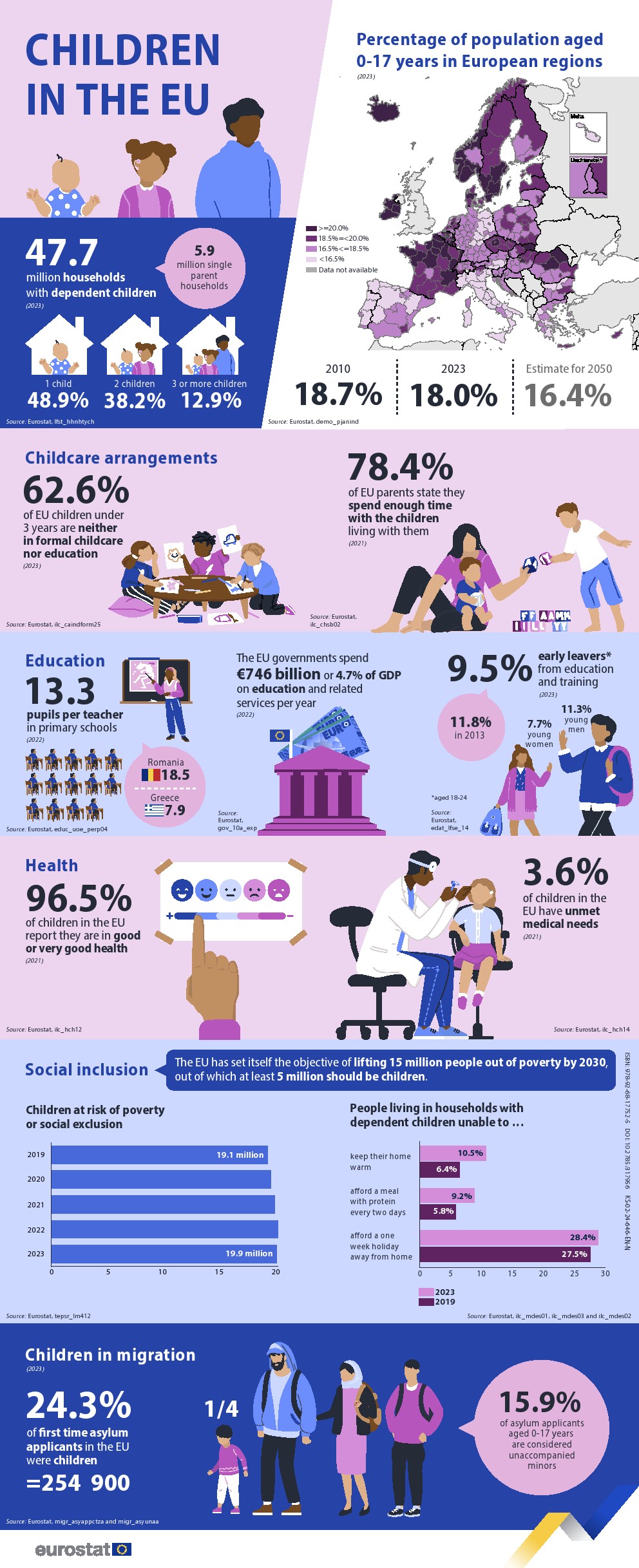 目前,欧盟有4770万家庭有儿童,其中48.9%有一个孩子,38.2%有两个孩子,12.9%有3个或更多孩子。590万个有孩子的家庭是单亲家庭。