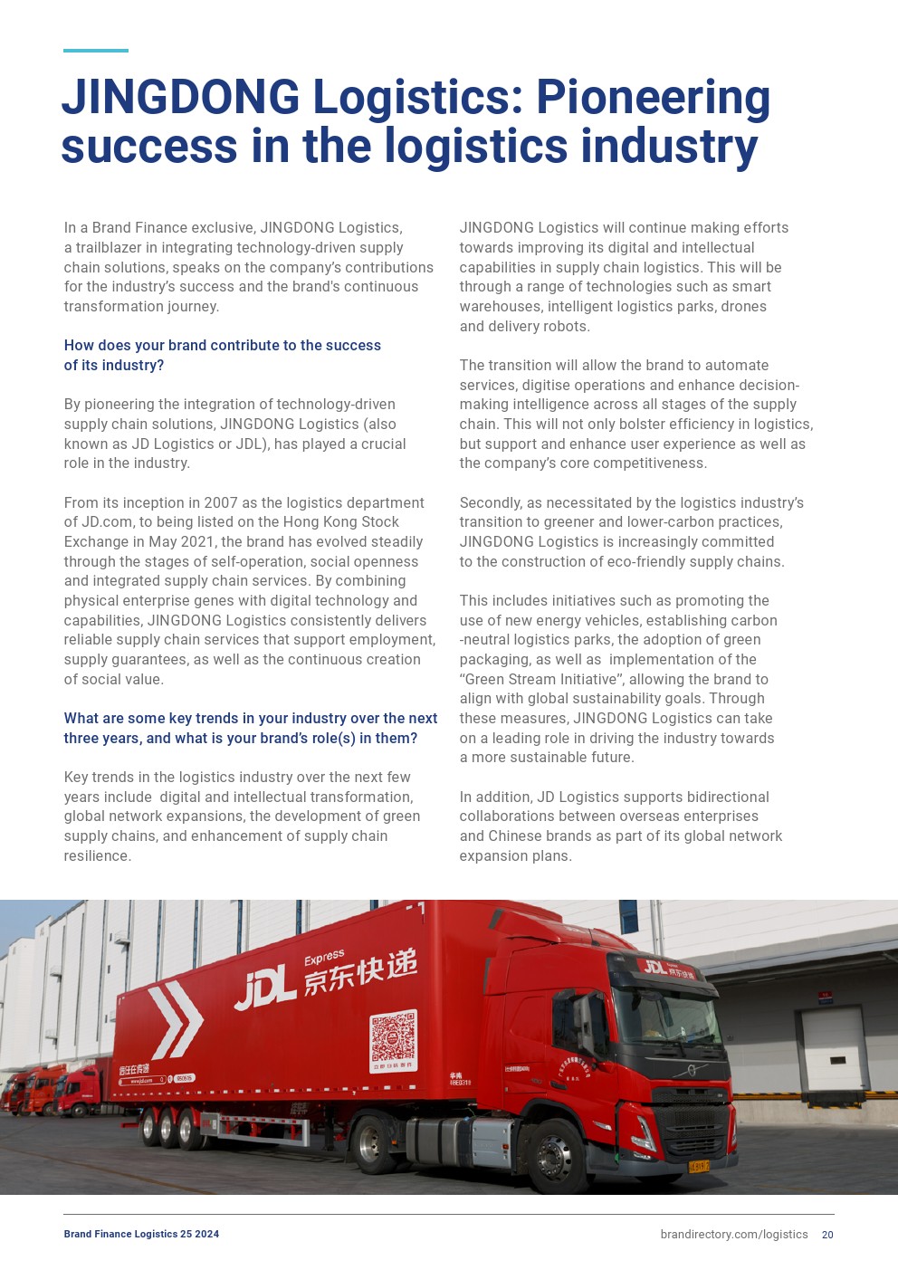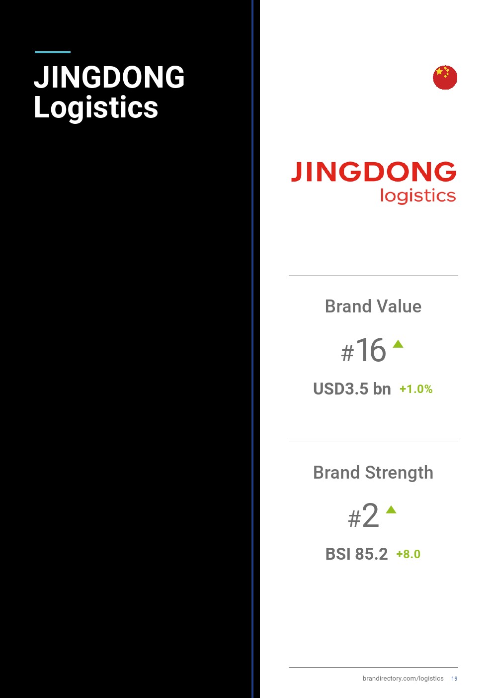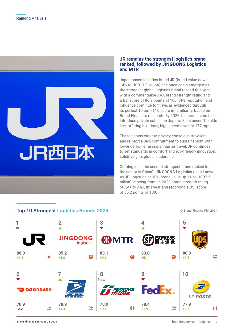 尽管品牌价值下降14%,达到119亿美元,但总部位于日本的JR仍然是全球最强大的物流品牌,获得AAA评级,品牌实力指数(BSI)得分为86.9分(满分100分)。中国京东物流(JD Logistics或JDL)排名第二,品牌价值增长1%,达到35亿美元,品牌实力评级从AA+提高到AAA, BSI得分为85.2分(满分100分)。港铁排名第三,品牌价值下降3%,达到35亿美元,保持AAA评级,BSI得分为83.1分(满分100分)。