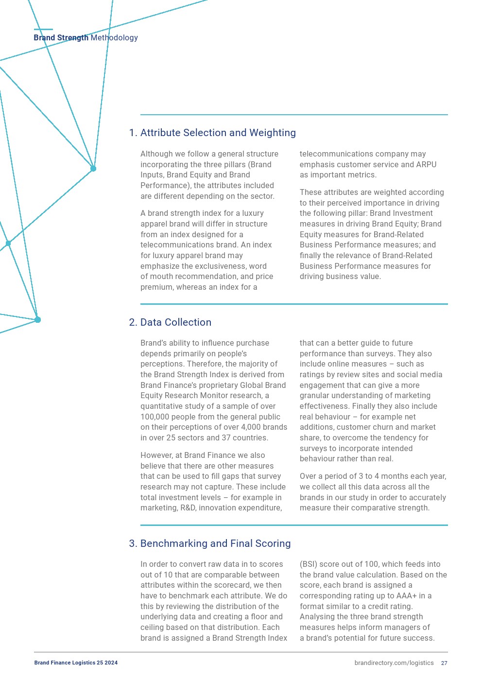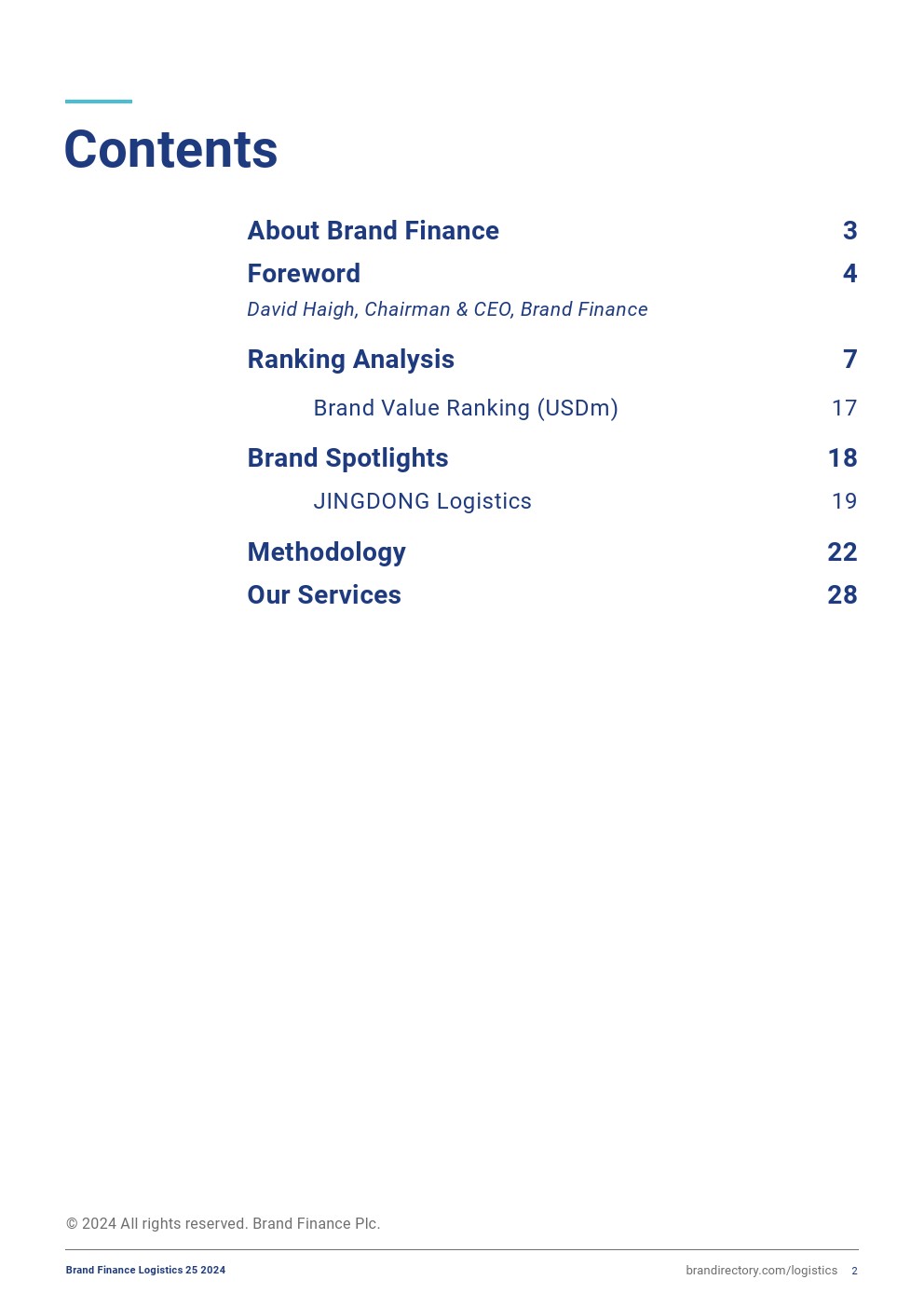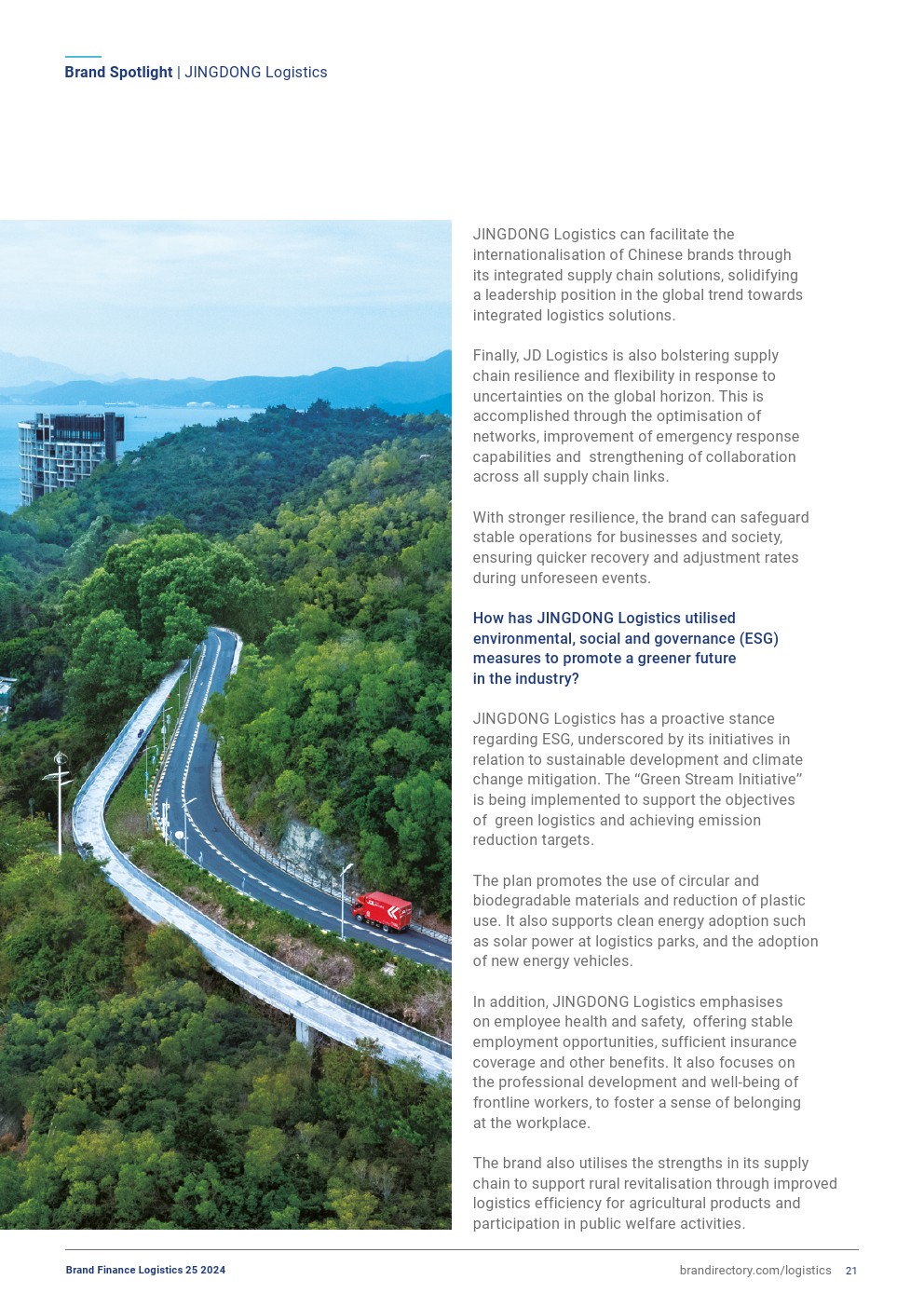 尽管品牌价值下降14%,达到119亿美元,但总部位于日本的JR仍然是全球最强大的物流品牌,获得AAA评级,品牌实力指数(BSI)得分为86.9分(满分100分)。中国京东物流(JD Logistics或JDL)排名第二,品牌价值增长1%,达到35亿美元,品牌实力评级从AA+提高到AAA, BSI得分为85.2分(满分100分)。港铁排名第三,品牌价值下降3%,达到35亿美元,保持AAA评级,BSI得分为83.1分(满分100分)。