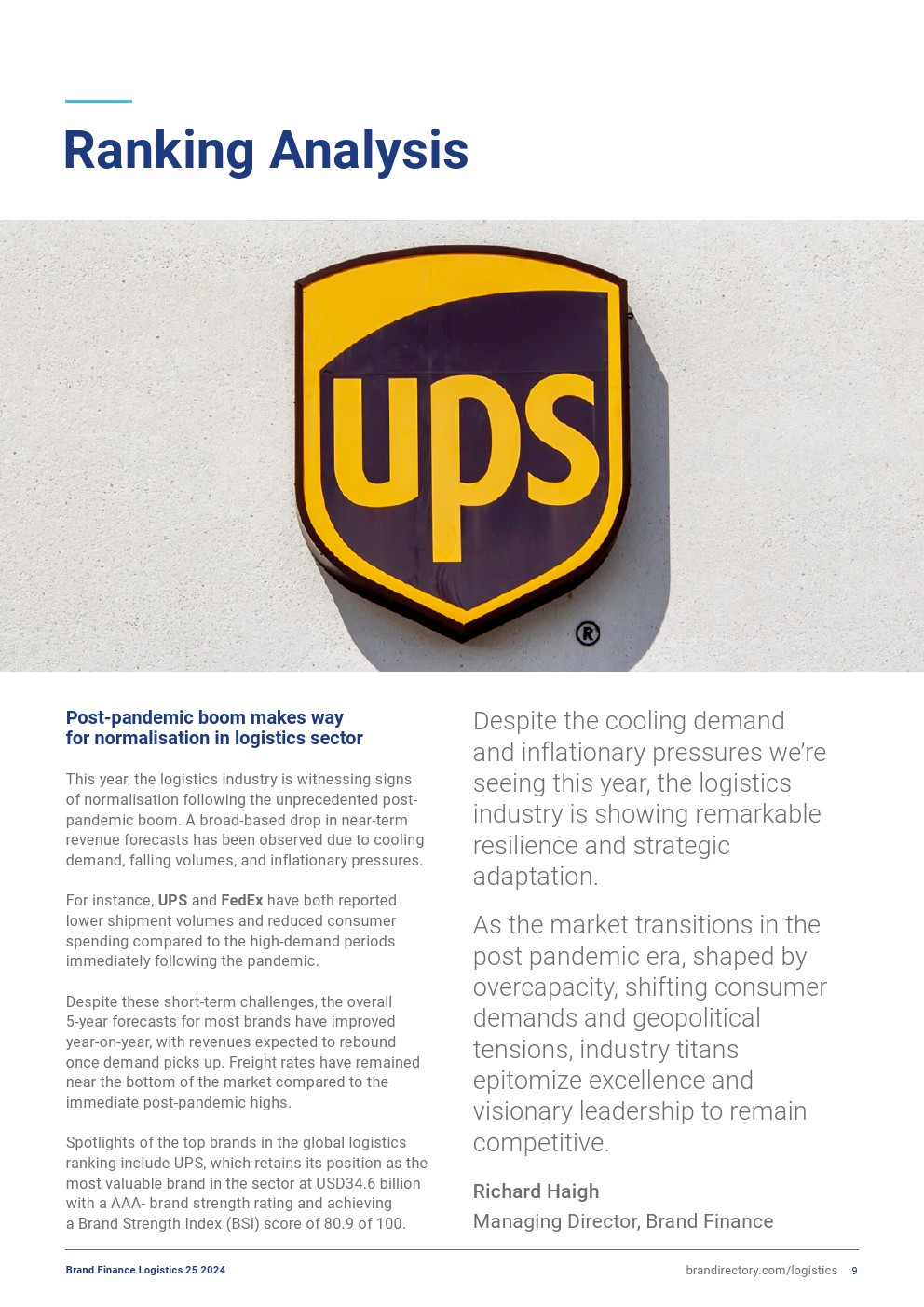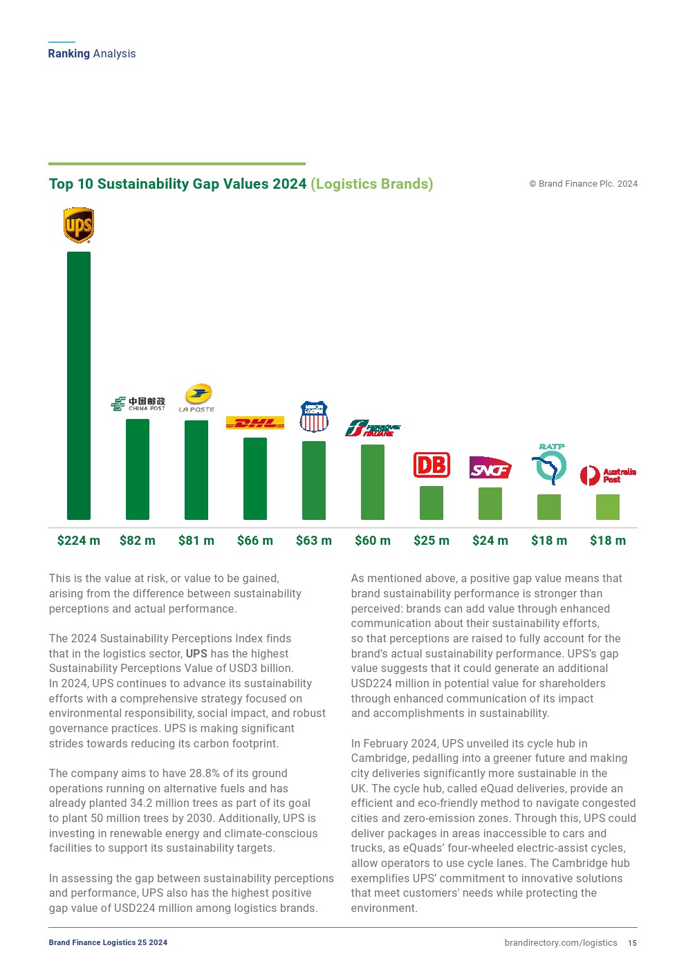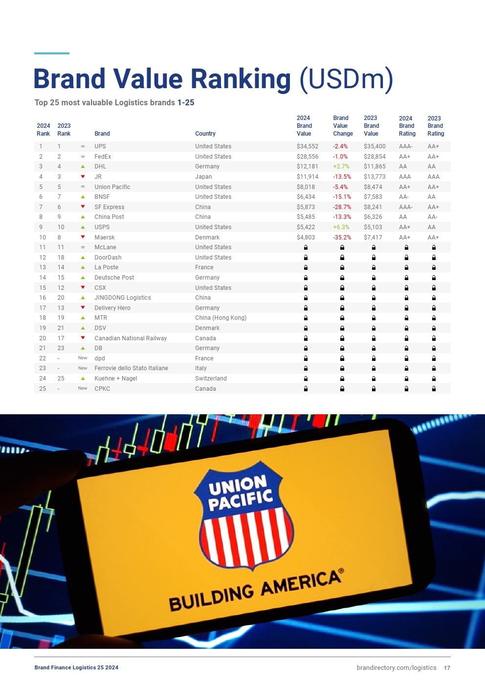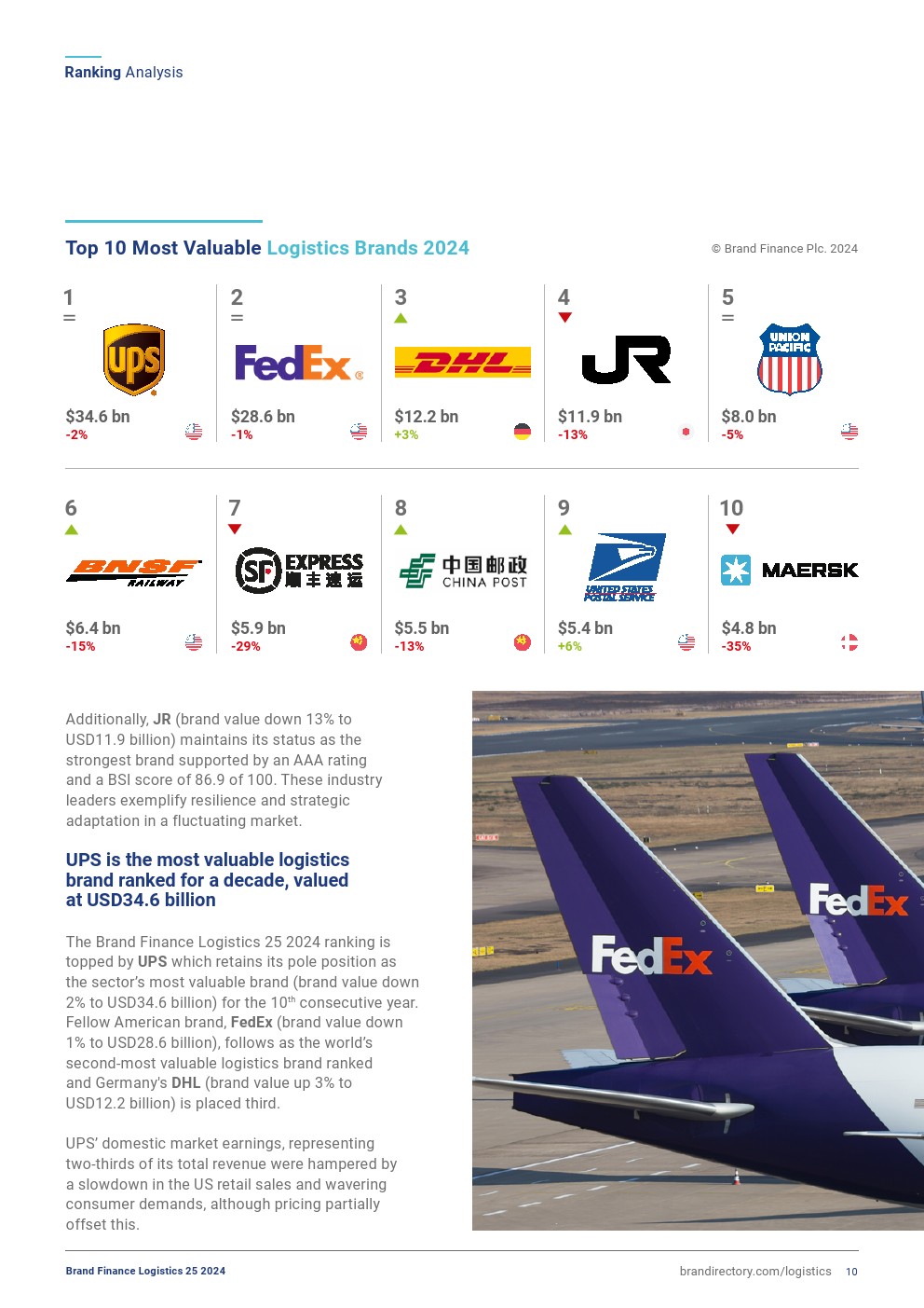 除了该行业的正常化趋势外,UPS在2024年Brand Finance物流排名中继续保持领先地位,连续10年保持其最具价值物流品牌的位置(品牌价值下降2%,达到346亿美元)。