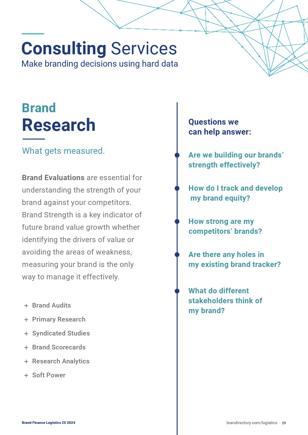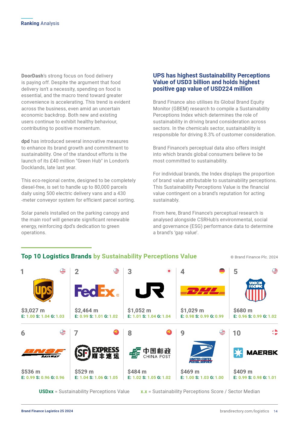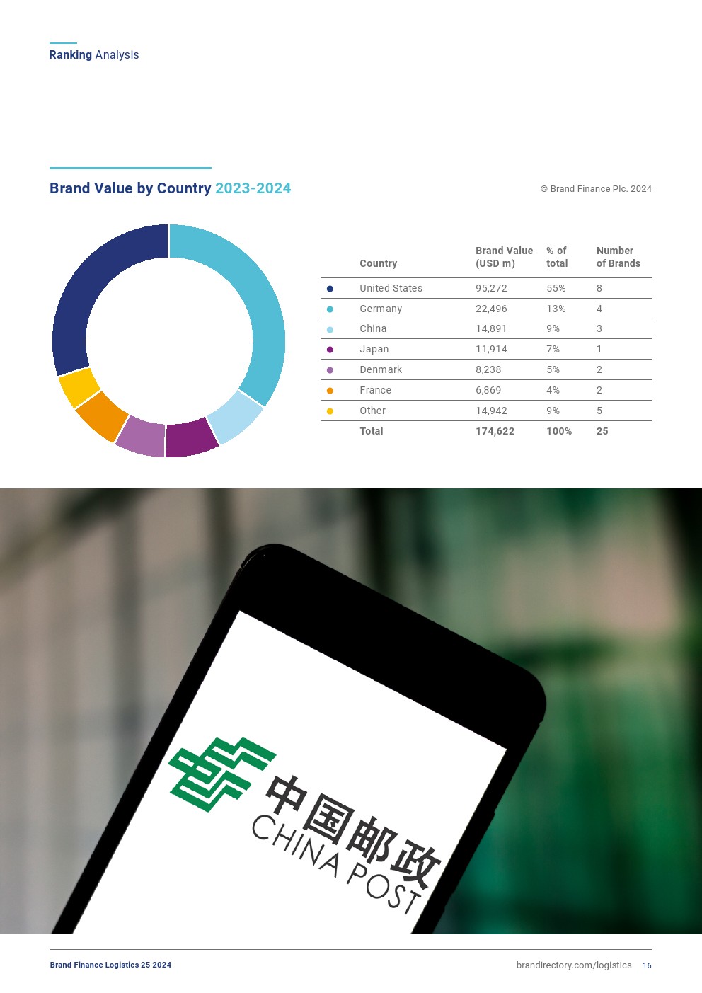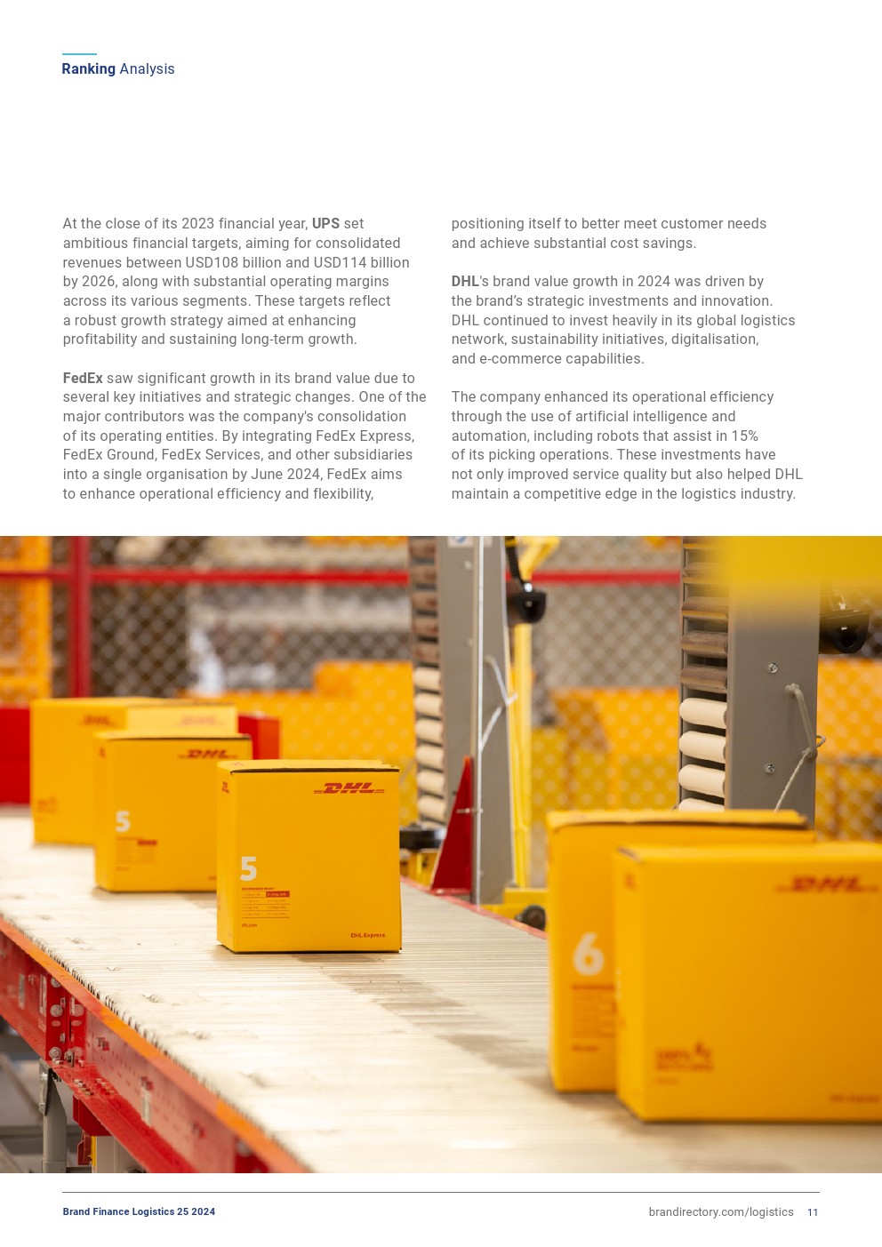 除了该行业的正常化趋势外,UPS在2024年Brand Finance物流排名中继续保持领先地位,连续10年保持其最具价值物流品牌的位置(品牌价值下降2%,达到346亿美元)。