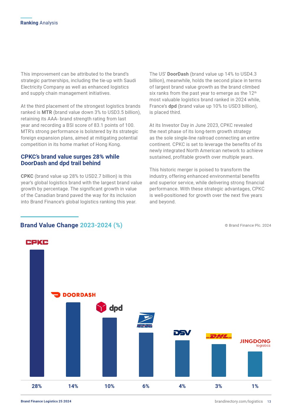CPKC的品牌价值飙升28%,DoorDash和dpd紧随其后