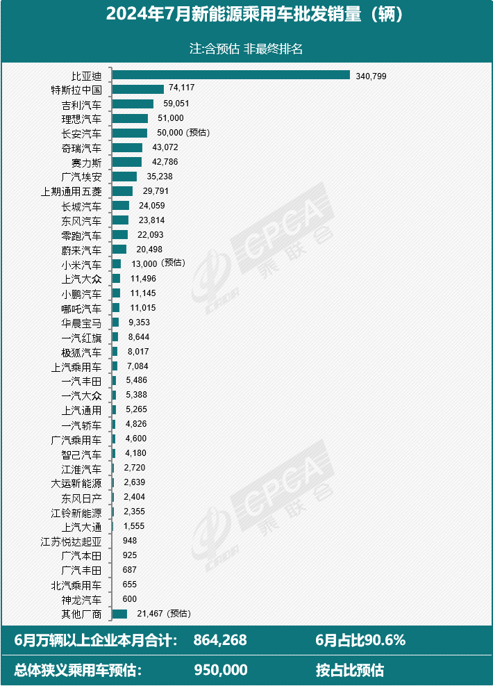 综上,根据月度初步数据综合预估7月全国新能源乘用车厂商批发销量95万辆,同比增长29%,环比下降3%。