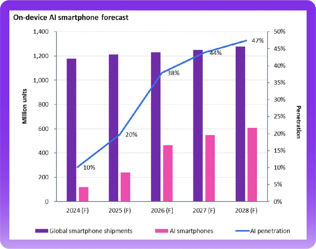 从2024年开始,支持On-device AI的智能手机预计将每年快速增长。特别是,On-device AI将扩展到高端和中端智能手机,2026年On-device AI智能手机的渗透率预计将大幅上升。由于芯片组公司的积极举措,预计从2025年起,On-device AI功能从最初仅应用于旗舰芯片,之后将依次向下部署。最终,即使是中低价位的智能手机也有望利用基本的On-device AI功能,如照片编辑、相机功能和翻译功能等,这将鼓励用户对使用人工智能的兴趣,并加速市场增长。2024年,On-device AI智能手机的总出货量预计为1.19亿部,占总出货量的10%。之后,预计销量将逐年稳步增长,2028年将达到6.06亿部,复合年增长率为38%。从2026年起,渗透率预计将在2028年提高到47%。