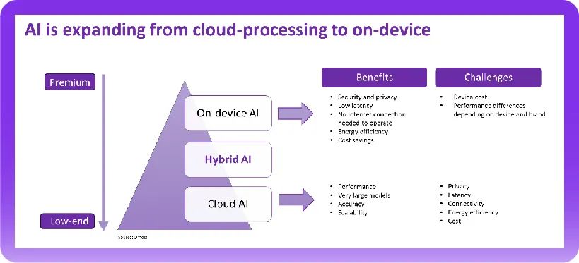 On-device AI和Cloud-AI两种方案均存在明显优势和劣势。首先,On-device AI方案借助端侧的芯片算力,可以实现低时延的响应和个性化的AI服务,同时可以将隐私数据保留至端侧,消除用户对数据安全的担忧。但是,目前支持On-device AI智能手机需要高规格的硬件,硬件成本高,用户的购买设备的成本自然也高。