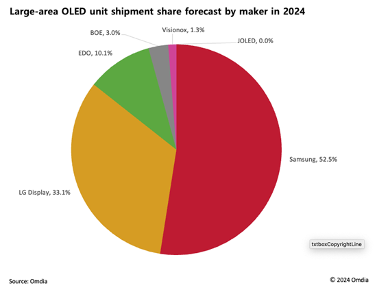 预计在2024年,三星显示将占据大尺寸OLED面板出货量的最大份额(52.5%),其次是LG 显示(33.1%)和和辉光电(10.1%)。韩国制造商预计今年将以85.6%的份额主导大尺寸OLED出货量,低于2023年的88.2%。造成这种下降的原因是中国大陆面板厂商的崛起,预计其市场份额将从2023年的11.8%增长到2024年的14.4%。中国大陆面板厂商正专注于平板电脑和笔记本电脑OLED出货量,并计划在不久的将来建立第8.6代IT OLED工厂。