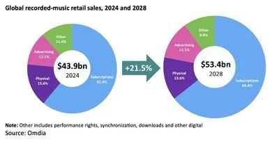 Omdia的数据包括消费者在实体和数字音乐及服务上的支出额,以及来自广告、演出权和影音同步权的交易收入。来自Spotify、Apple Music和YouTube Music等平台的订阅收入预计将对销售额增长起主要推动作用,从2023年的243亿美元增至268亿美元,增幅达10.4%。订阅收入预计将在2028年超过344亿美元,预测期内的复合年增长率为7.2%。