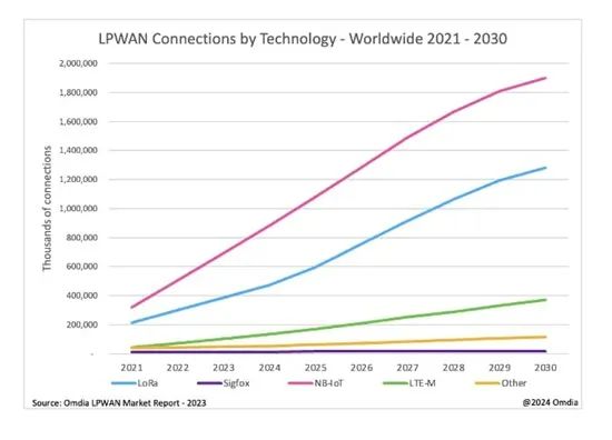 NB-IoT在中国的普及推动了其显著增长,而LoRaWAN则在大多数其他地区处于领先地位。这两种技术都非常适合目前需求旺盛的中端物联网应用,从而确保了它们在 LPWAN 市场上的持续领先地位。