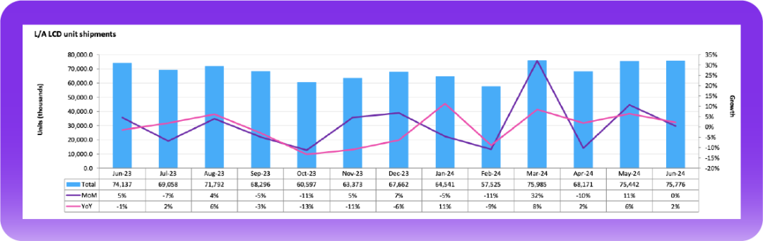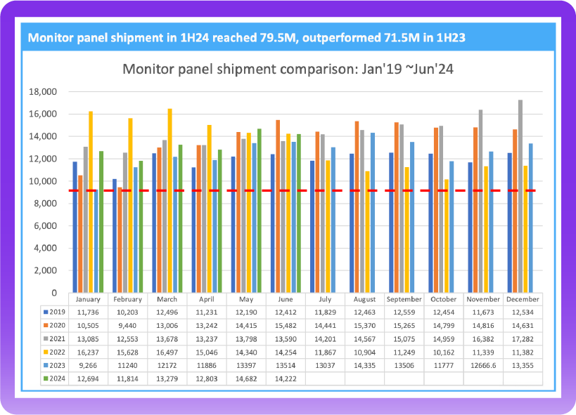 而IT面板2024年上半年出货表现亮眼。显示器面板出货达到7,950万片,远高于2023年上半年的7,113万片。