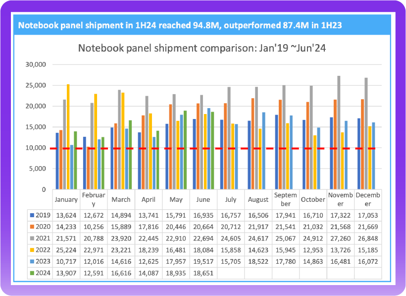 笔记本电脑面板的情况也与显示器面板出货表现差不多。2024年上半年,笔记本电脑面板出货达到9,480万片,也远高于2023年上半年的8,745万片,成长明显。