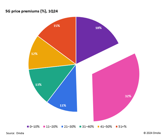 5G比4G更昂贵。我们调查的5G服务大多数(32%)是收取11-20%的额外费用,18%的5G服务收取0-10%的额外费用。两者相加,即半数的5G服务收取的额外费用低于20%。