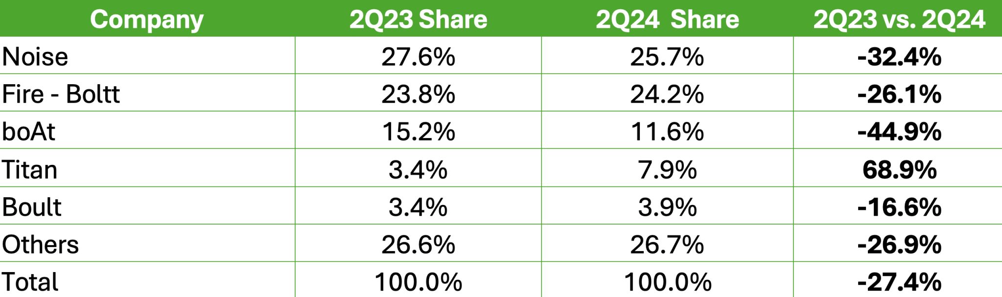 印度智能手表市场的前三名都是国内品牌:Noise、Fire-Boltt 和 boAt。它们在第二季度都出现了大幅下滑。由于各品牌纷纷降价清理库存,印度智能手表的平均售价也从一年前的 25.6 美元降至 20.6 美元。