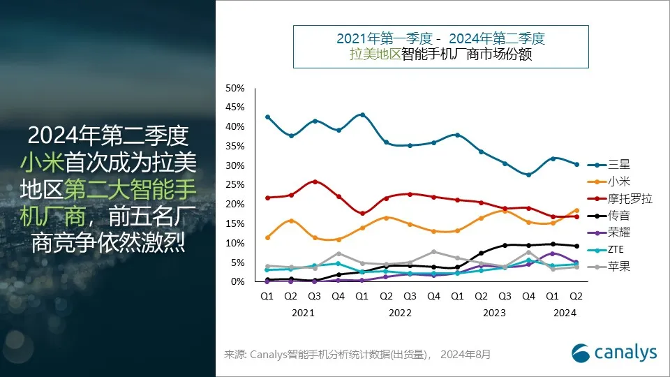 市场分析机构Canalys报告显示,2024年第二季度,拉美地区智能手机市场连续四个季度实现双位数增长,出货量达3350万部,同比增长20%。