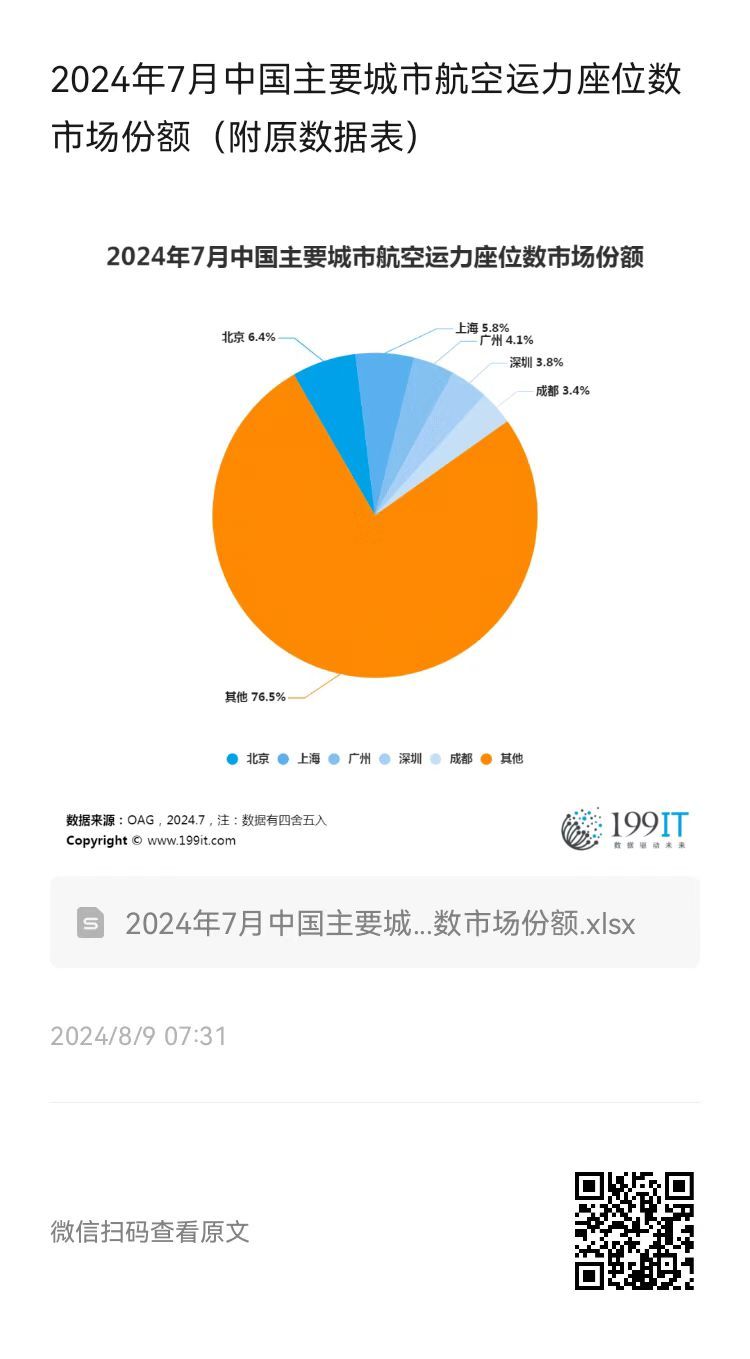 - 2024年7月中国主要城市航空运力座位数及同比(附原数据表)