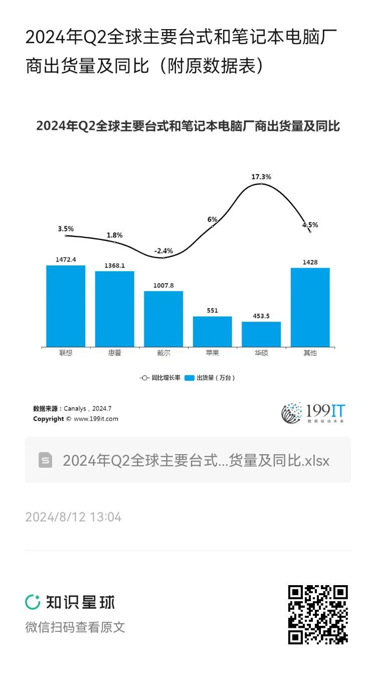 - 2024年Q2全球主要台式和笔记本电脑厂商出货量市场份额(附原数据表)