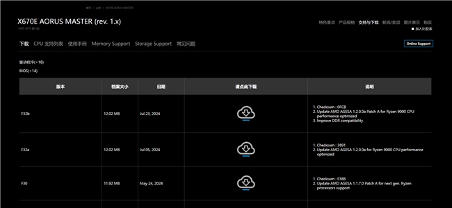 AGESA 版本时,能及时提供 BIOS 更新。玩家如果想取得最新版本 BIOS,可前往技嘉官方网站:https://www.gigabyte.com/Support/Consumer/Download进行下载。
