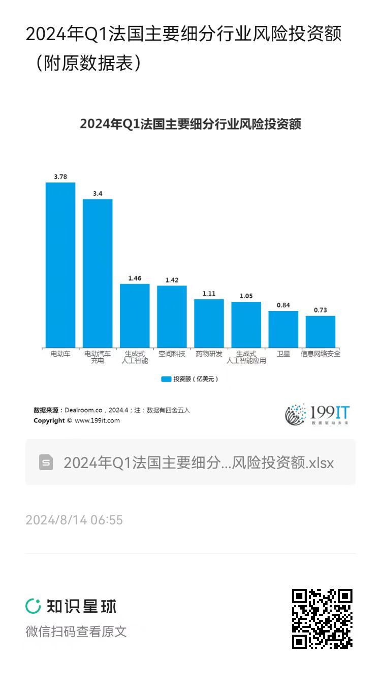 2024年Q1法国主要细分行业风险投资额(附原数据表) 更多阅读:2024年全球主要行业风险投资额(附原数据表) 2024年Q1德国主要细分行业风险投资额(附原数据表) 2024年Q1-2025年Q1加拿大风险投资额(附原数据表) 2024年法国主要行业风险投资额(附原数据表) 2024年英国主要行业风险投资额(附原数据表) 2024年亚洲主要城市和区域风险投资额及同比(附原数据表) 2023年欧洲主要行业风险投资额及同比(附原数据表) 2023年美国主要行业风险投资额(附原数据表) 2024年东南亚主要行业风险投资额(附原数据表) 2024年Q1法国主要行业风险投资额(附原数据表) 2023年美国主要行业分支风险投资额(附原数据表) 2024年德国主要行业风险投资额(附原数据表) 2024年Q1德国主要行业风险投资额(附原数据表) 2018年-2023年8月全球对中国公司风险投资额(附原数据表) 2019年Q1-2020年Q2美团点评到店和酒旅收入及增长率(附原数据表)