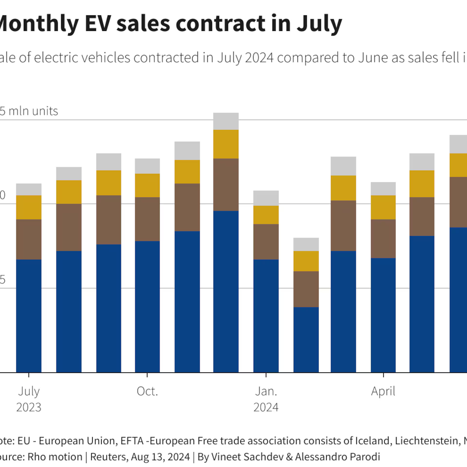 在欧洲,7 月份月销量下降 7.8%,年初至今的数据与 2023 年持平。截至 7 月的 7 个月内,欧盟最大的电动汽车市场德国的电动汽车销量下降了 12%。