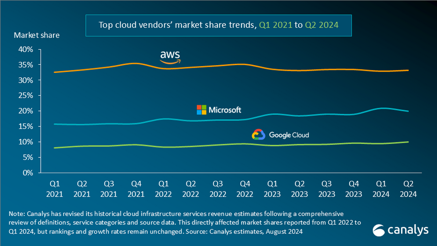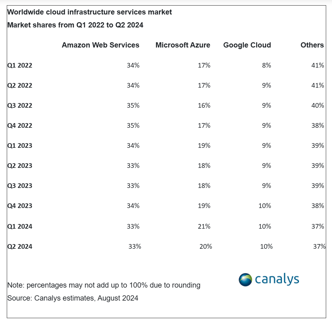 2024年第二季度,全球云基础设施服务支出同比增长19%,达到782亿美元。虽然企业的IT预算已经恢复增长,但很大一部分支出现在直接用于与人工智能相关的投资。前三大供应商——AWS、微软Azure和谷歌云——本季度共增长24%,占总支出的63%。与上一季度相比,AWS的增长明显增加,第二季度的销售额增长了19%。与此同时,微软Azure和谷歌云继续保持强劲的两位数增长,分别增长29%和30%。全球超过1/3的云市场份额仍由其他云提供商占据,但市场正在向顶级超大规模云提供商转移,它们的市场份额越来越大。