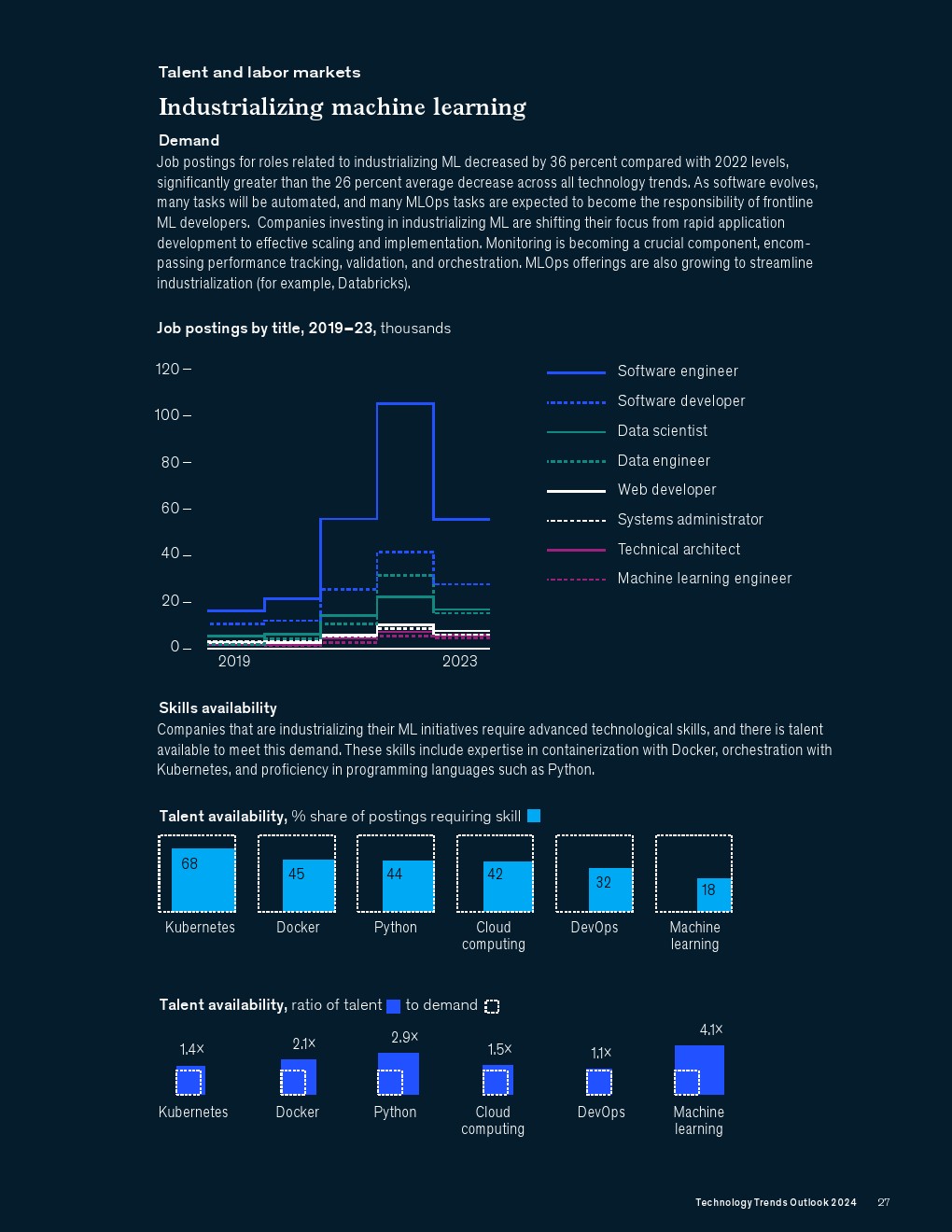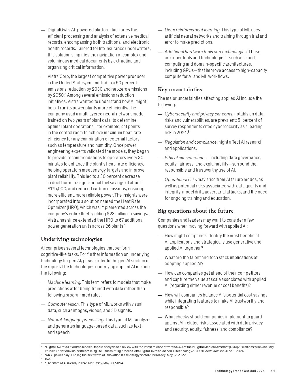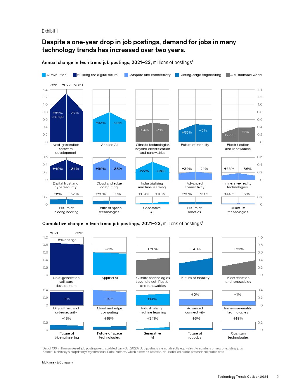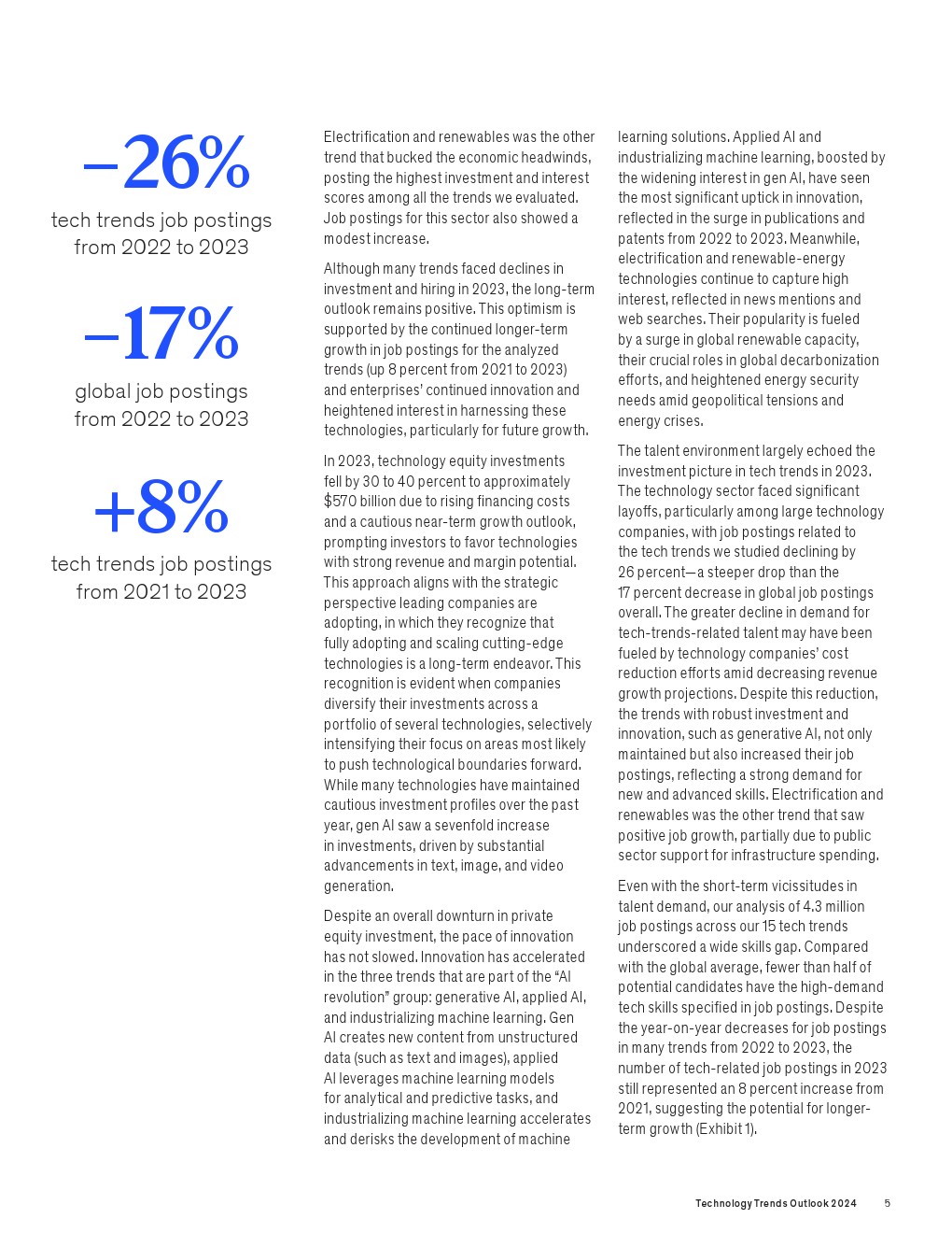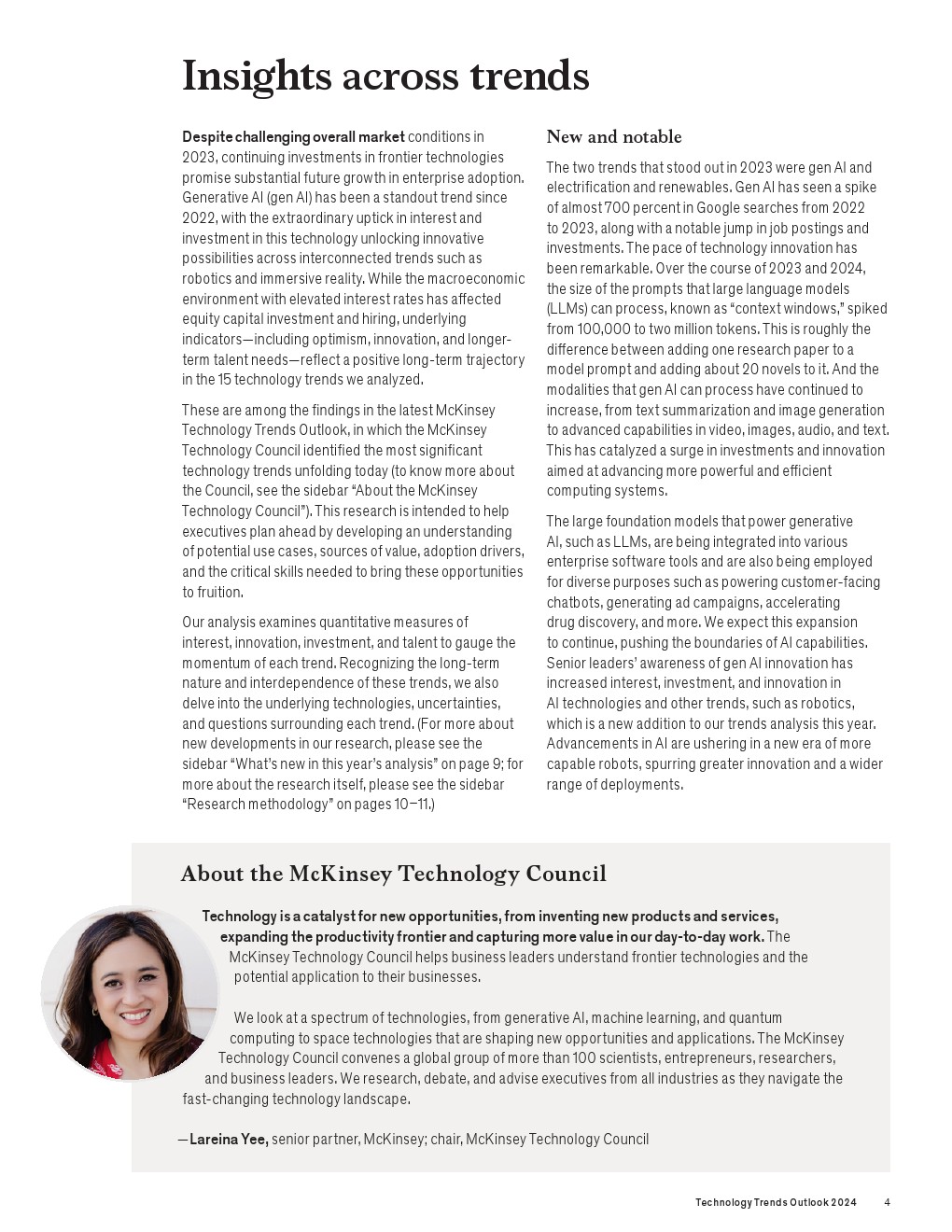 2023年最突出的两个趋势是人工智能、电气化和可再生能源。从2022年到2023年,谷歌对新一代人工智能的搜索量飙升了近700%,招聘信息和投资也出现了显著增长。技术创新的步伐是惊人的。在2023年和2024年期间,大型语言模型(llm)可以处理的提示(称为“上下文窗口”)的大小从10万个标记飙升至200万个标记。这大致相当于在模型提示中添加一篇研究论文和添加大约20本小说之间的区别。人工智能可以处理的模式也在不断增加,从文本摘要和图像生成到视频、图像、音频和文本的高级功能。这促进了投资和创新的激增,旨在推进更强大、更高效的计算系统。