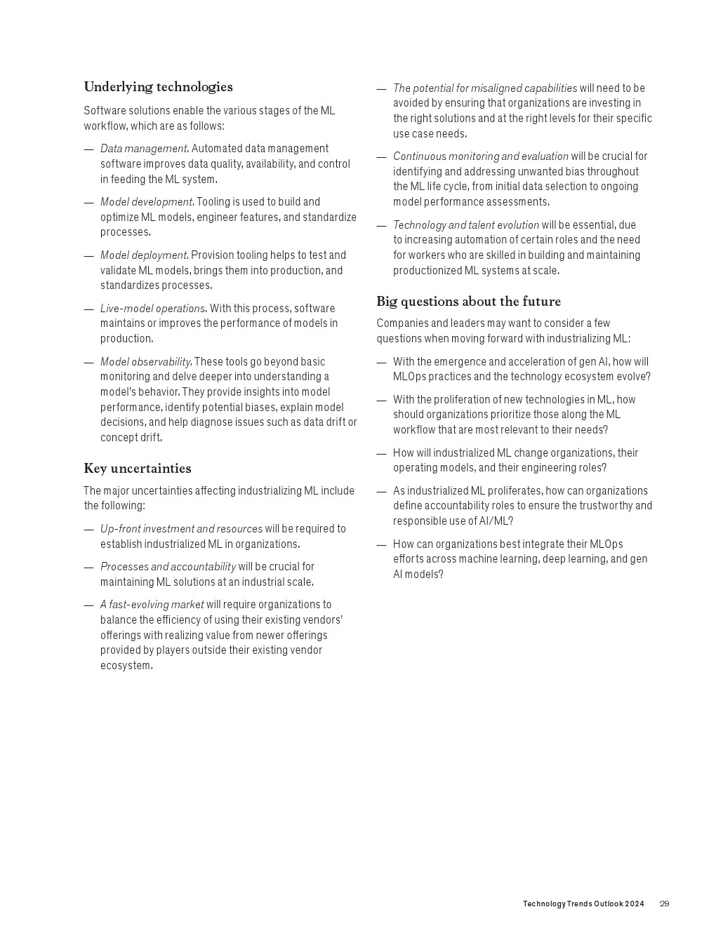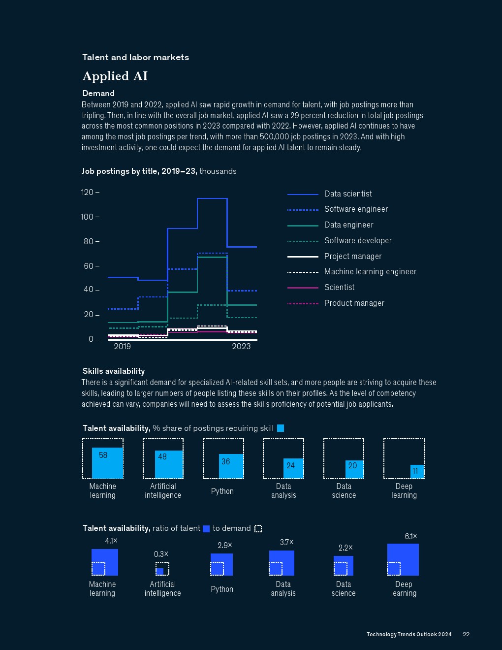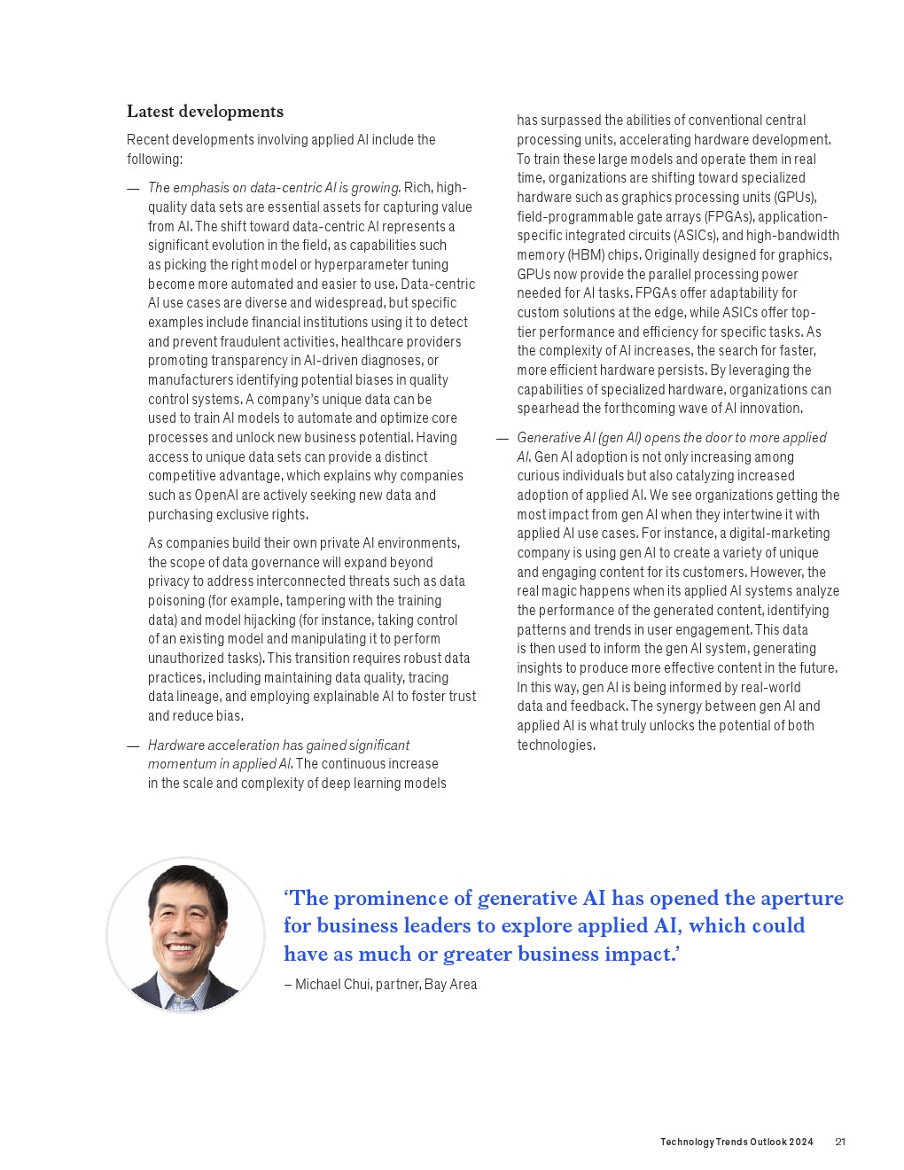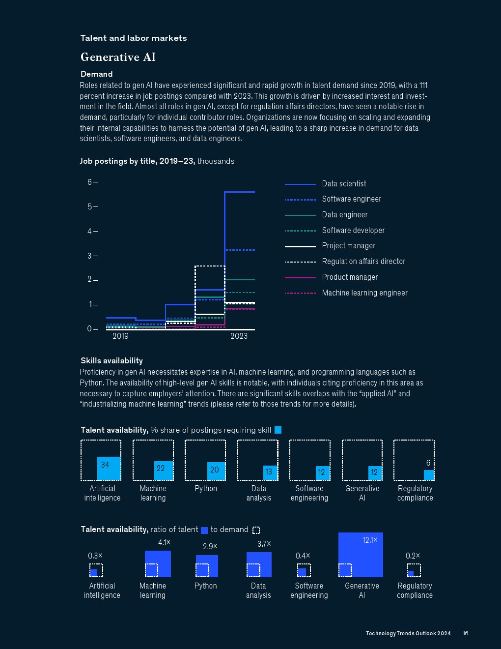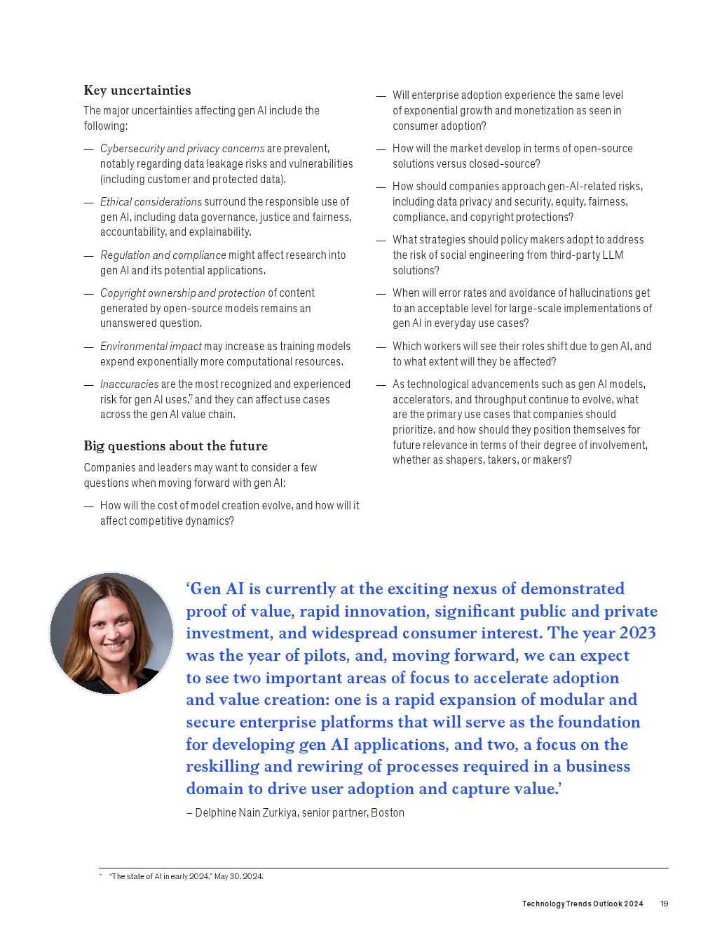 2023年最突出的两个趋势是人工智能、电气化和可再生能源。从2022年到2023年,谷歌对新一代人工智能的搜索量飙升了近700%,招聘信息和投资也出现了显著增长。技术创新的步伐是惊人的。在2023年和2024年期间,大型语言模型(llm)可以处理的提示(称为“上下文窗口”)的大小从10万个标记飙升至200万个标记。这大致相当于在模型提示中添加一篇研究论文和添加大约20本小说之间的区别。人工智能可以处理的模式也在不断增加,从文本摘要和图像生成到视频、图像、音频和文本的高级功能。这促进了投资和创新的激增,旨在推进更强大、更高效的计算系统。