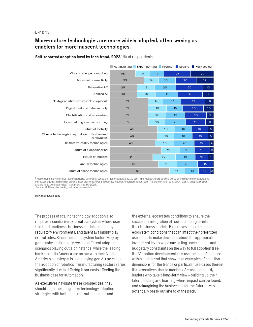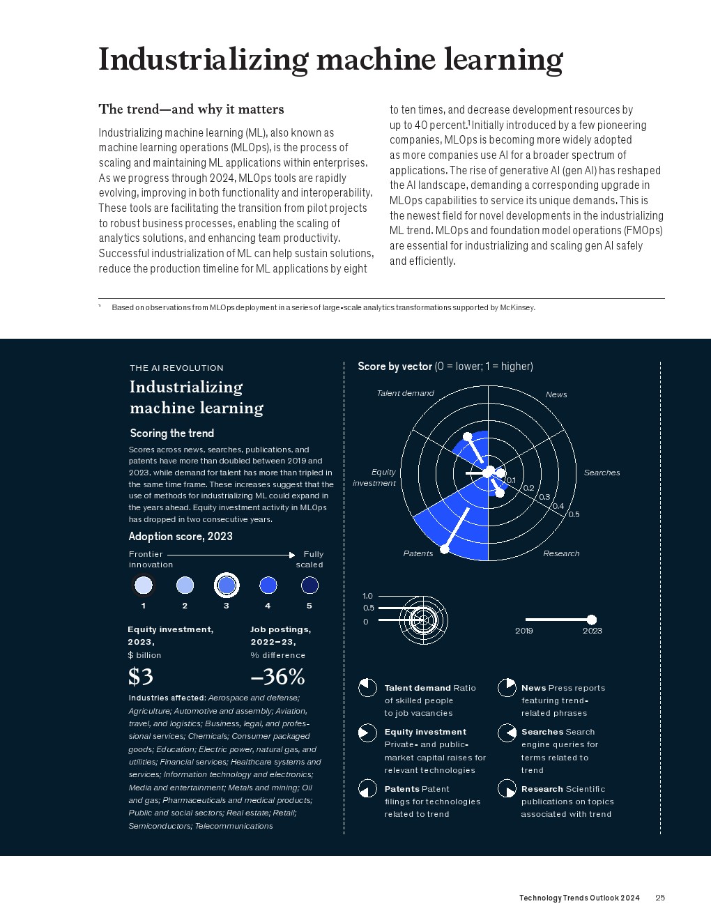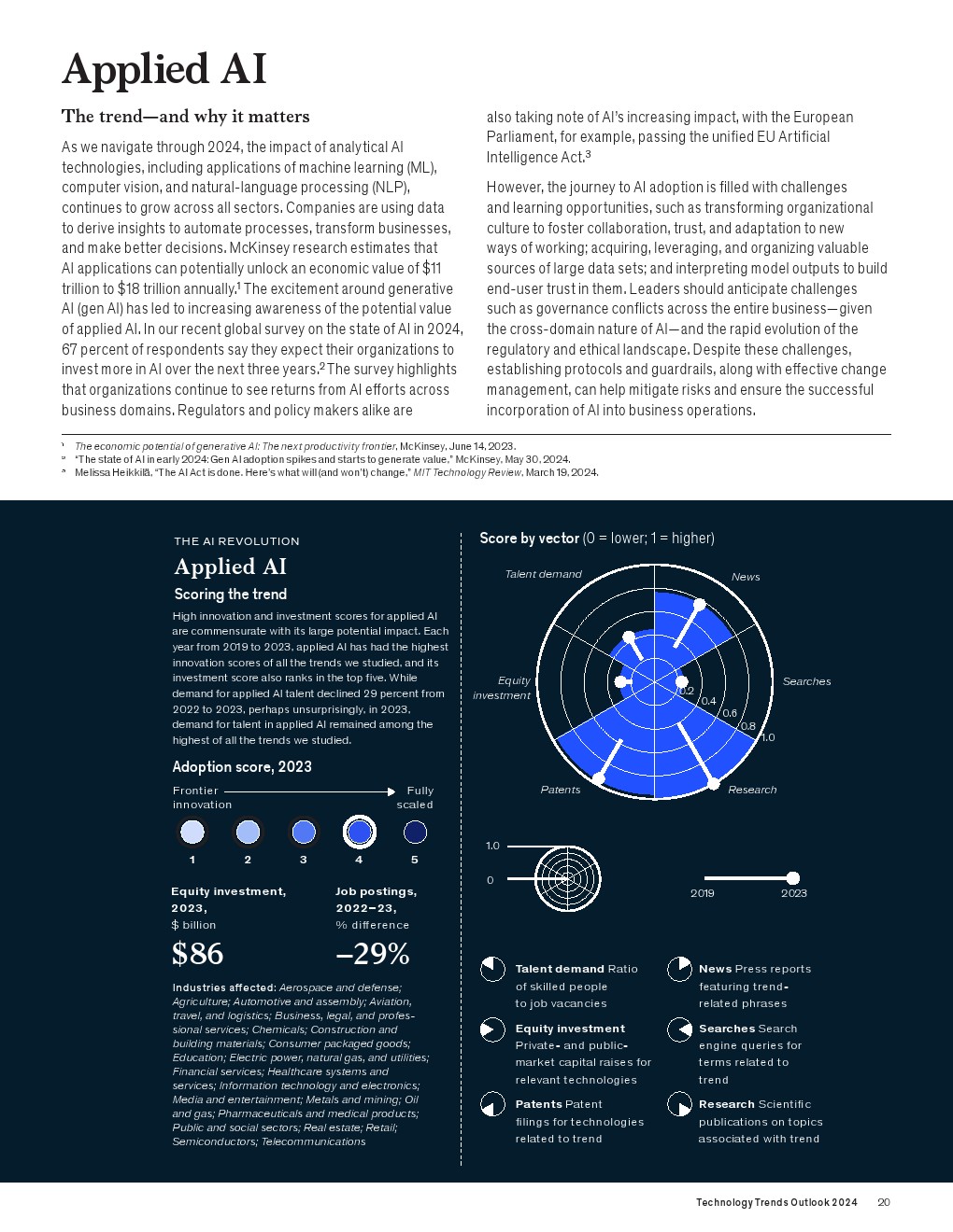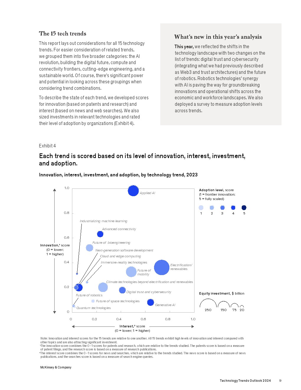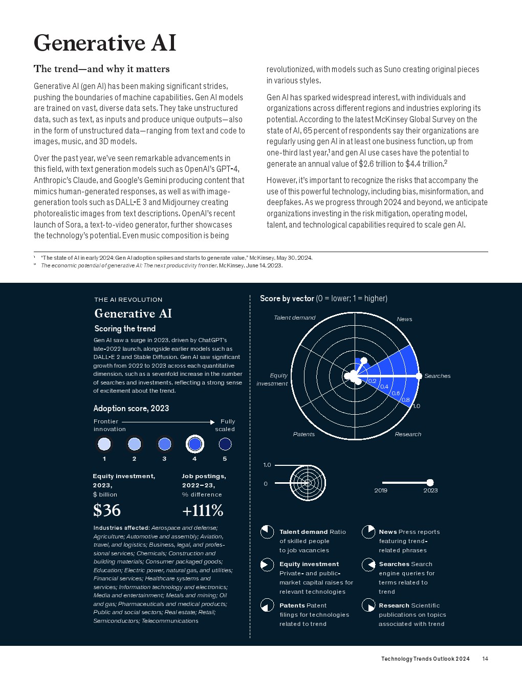 麦肯锡发布了“2024年科技趋势展望”。尽管2023年整体市场环境充满挑战,但对前沿技术的持续投资有望在企业采用方面实现大幅增长。自2022年以来,生成式人工智能(gen AI)一直是一个突出的趋势,对这项技术的兴趣和投资的急剧上升,为机器人技术和沉浸式现实等相互关联的趋势解锁了创新的可能性。虽然利率上升的宏观经济环境影响了股权资本投资和招聘,但在分析的15个技术趋势中,包括乐观、创新和长期人才需求在内的潜在指标反映了积极的长期轨迹。