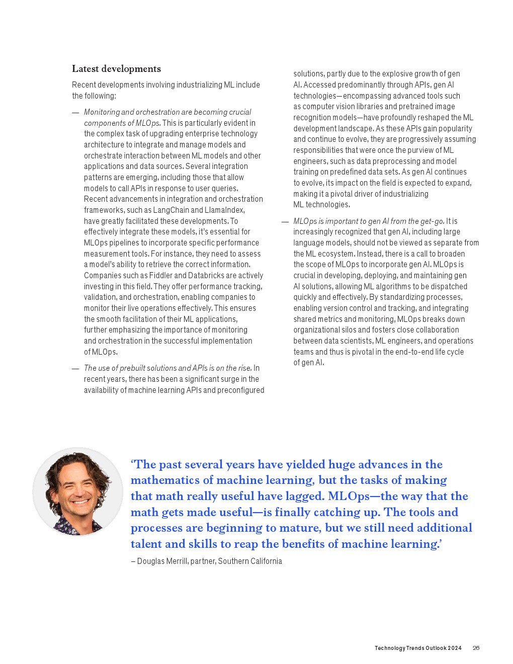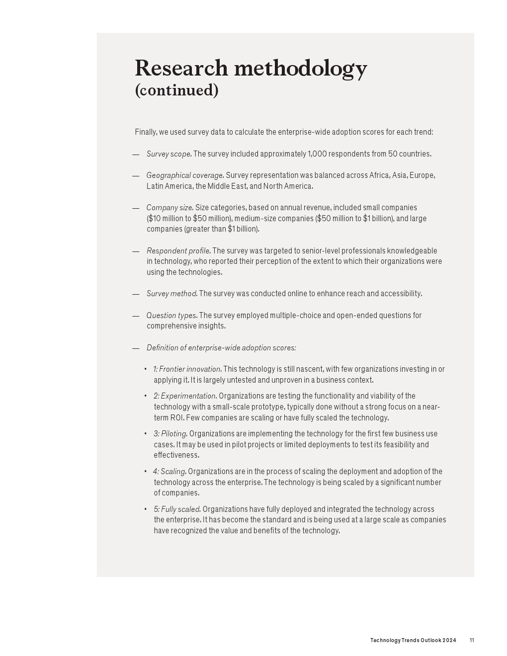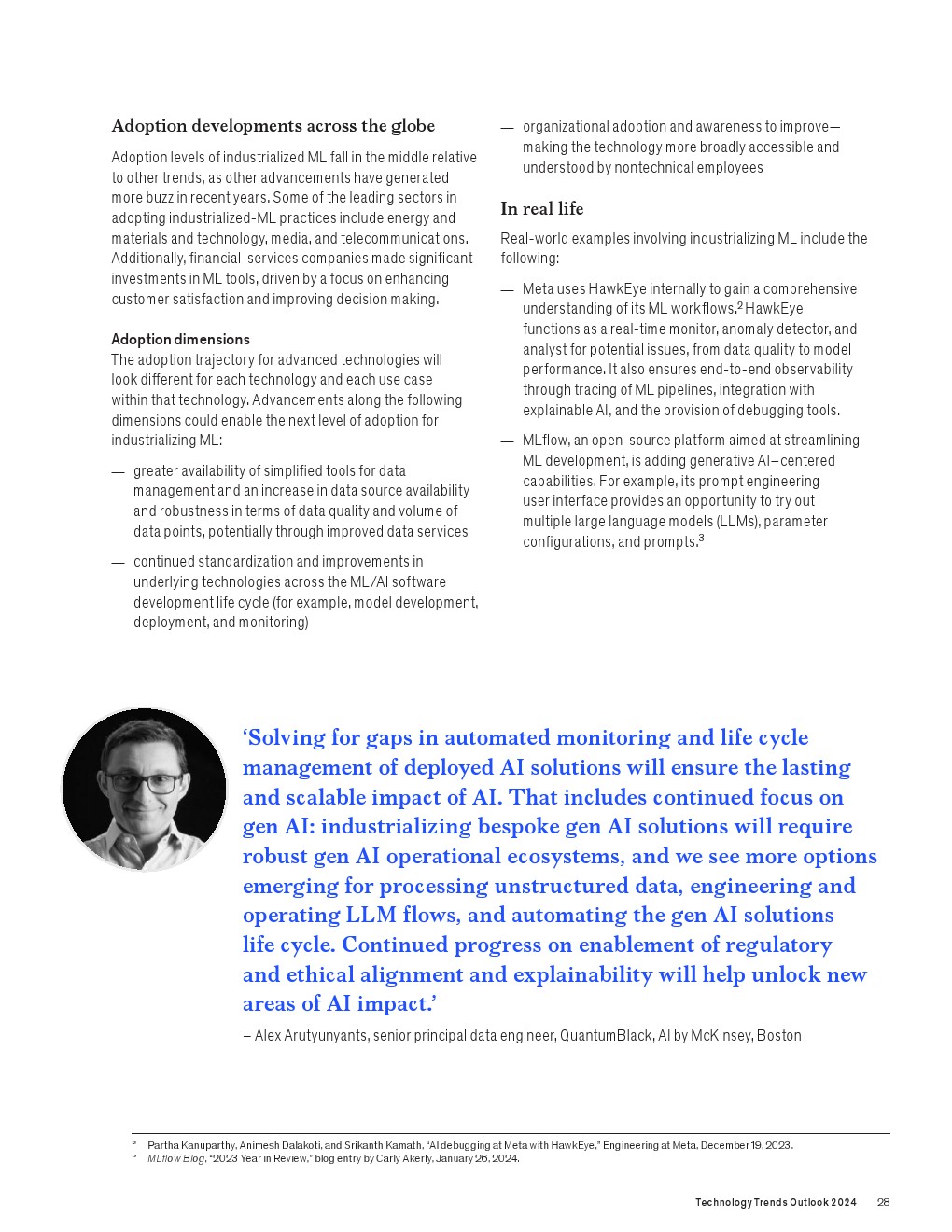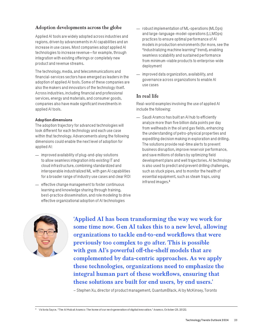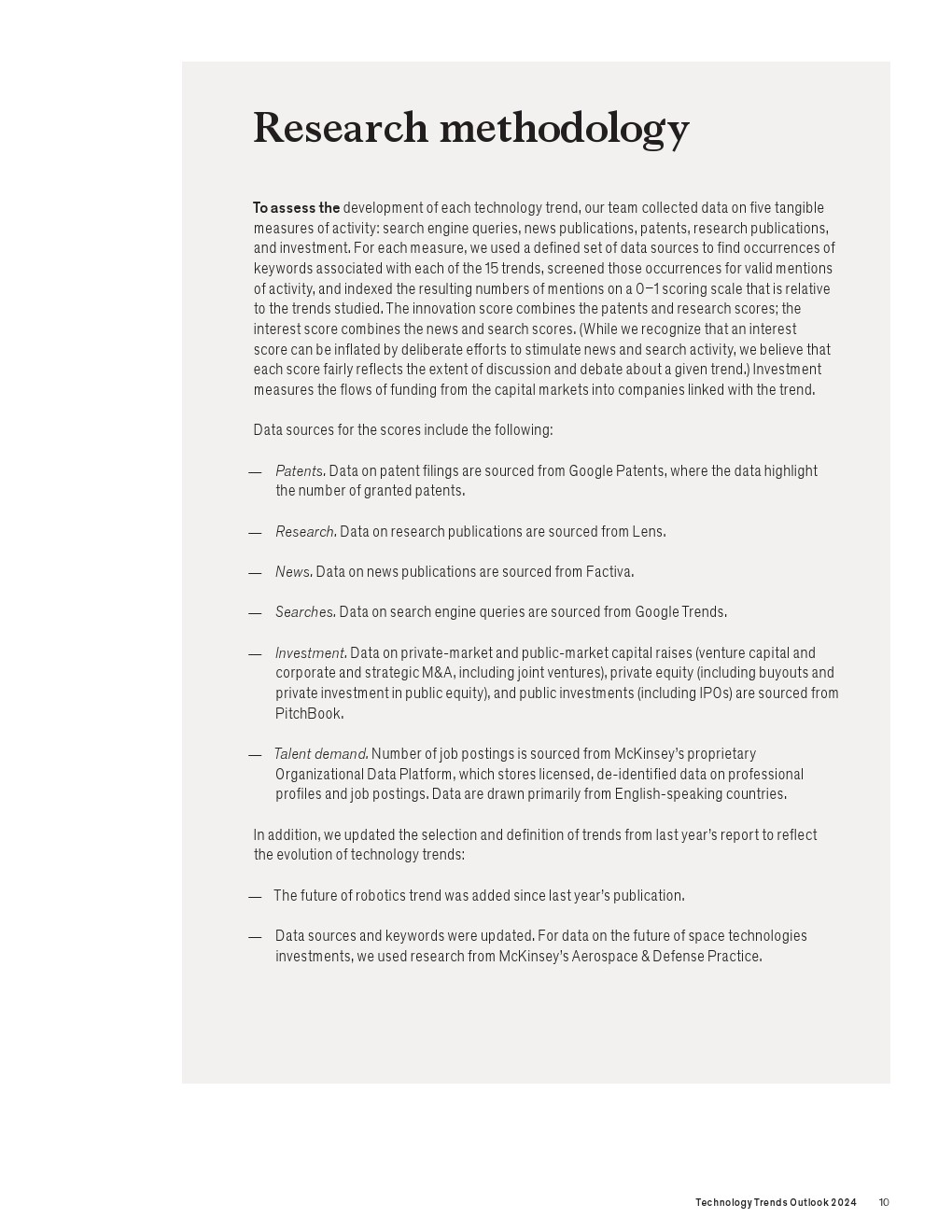 麦肯锡发布了“2024年科技趋势展望”。尽管2023年整体市场环境充满挑战,但对前沿技术的持续投资有望在企业采用方面实现大幅增长。自2022年以来,生成式人工智能(gen AI)一直是一个突出的趋势,对这项技术的兴趣和投资的急剧上升,为机器人技术和沉浸式现实等相互关联的趋势解锁了创新的可能性。虽然利率上升的宏观经济环境影响了股权资本投资和招聘,但在分析的15个技术趋势中,包括乐观、创新和长期人才需求在内的潜在指标反映了积极的长期轨迹。