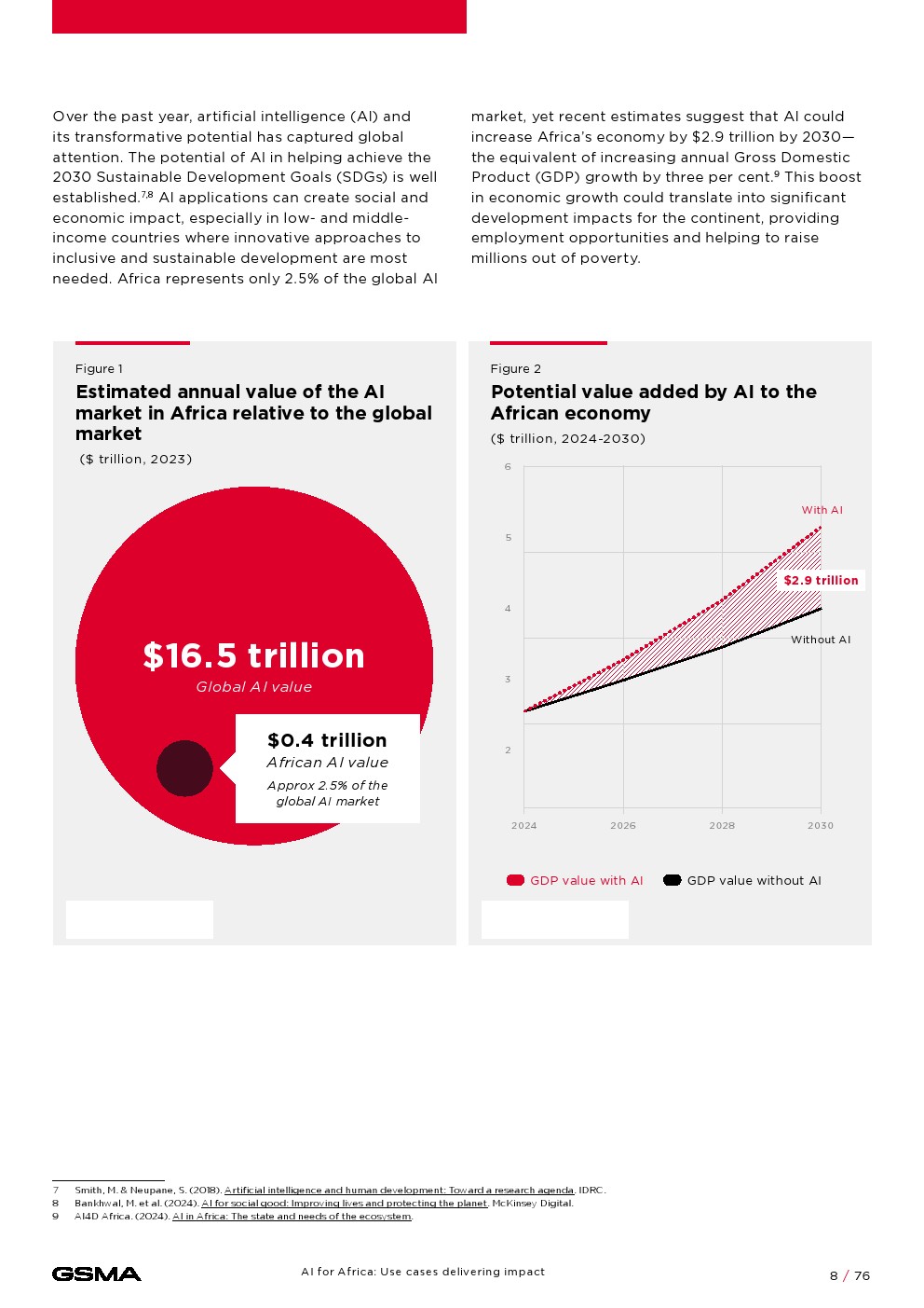 非洲目前仅占全球人工智能市场的2.5%,但新兴的人工智能应用有可能在2030年之前将非洲的经济增长提高2.9万亿美元。