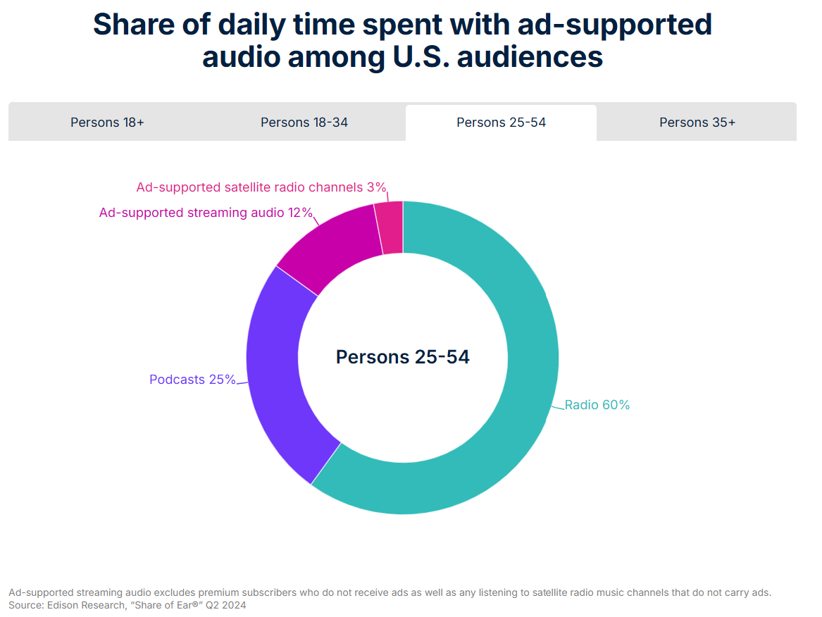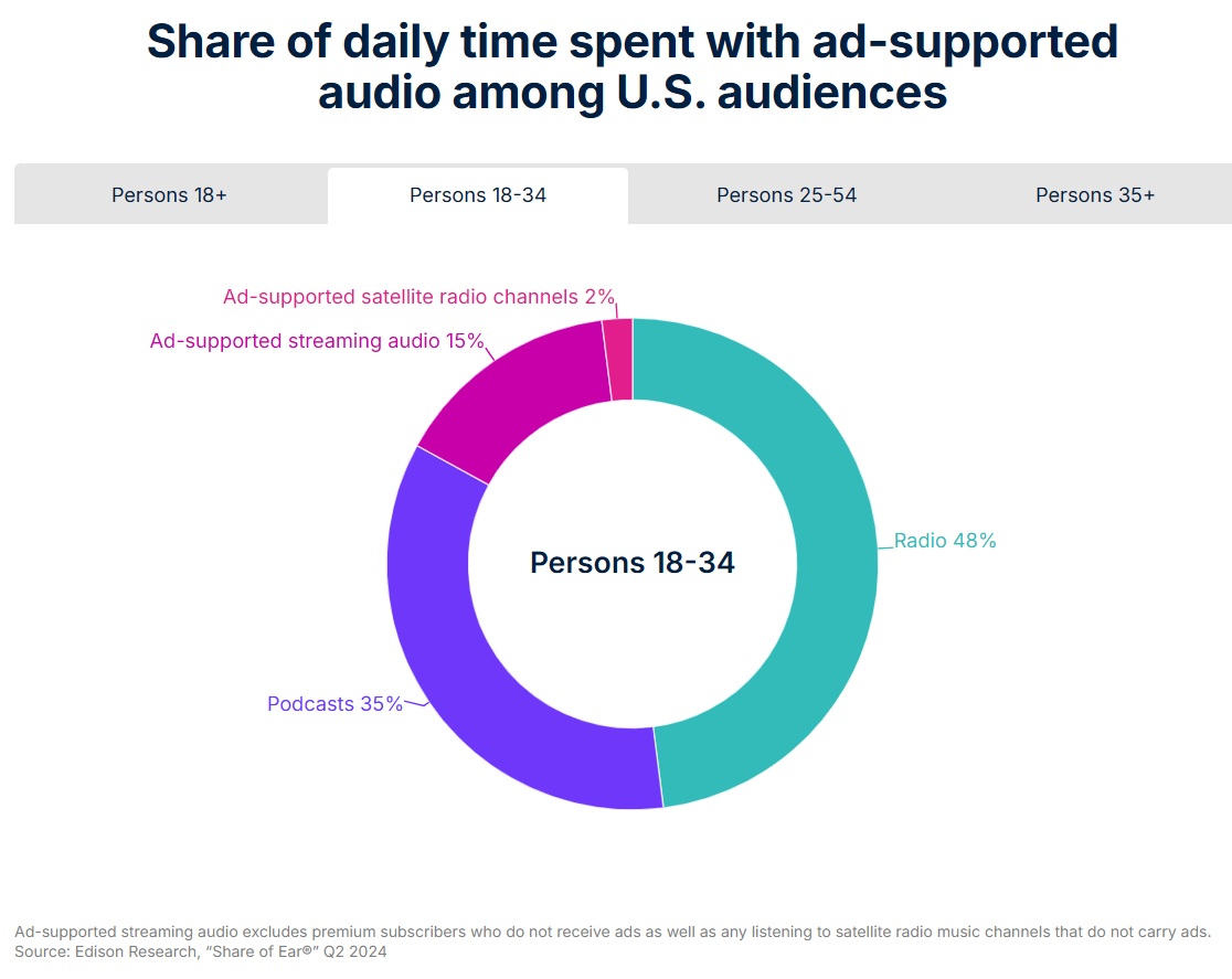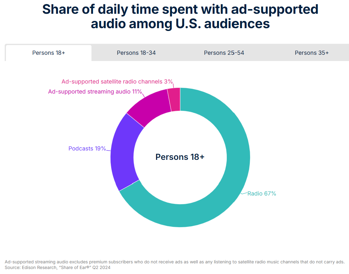 在2024年4月至6月期间,听众每天花在广告支持音频上的时间有67%是广播,19%是花在播客上的,11%是花在流媒体音频服务上的,3%是花在卫星广播上的。在18-34岁的人群中,广播的时间份额从第一季度的45%上升到第二季度的48%,而播客的时间份额从37%略微下降到35%。