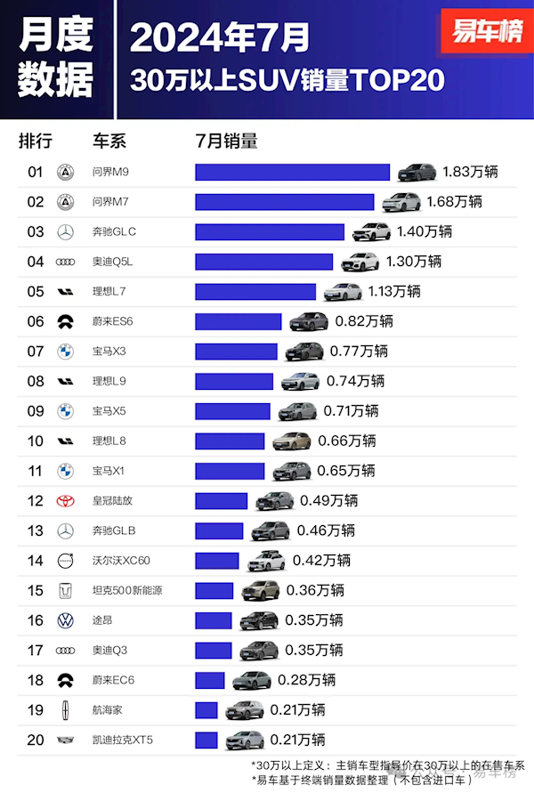 近日易车发布了2024年7月30万以上SUV销量TOP20榜。(注:30万以上,指主销车型30万以上的在售车系,不包含进口车)第一名是今年大放异彩的问界M9,7月份卖出了1.83万辆,而且就均价而言,它可是达到了55万,放到30万以上的限定区间内含金量更强。第二名同样来自问界,也就是M7,7月份卖出1.68万辆。今年M7累计销量已超13万,而这款车累计总销量超过了20万。虽然M7的底子弱,但智能化的长板确实长,不得不说,有了华为的帮扶,M7确实改头换面一飞冲天。