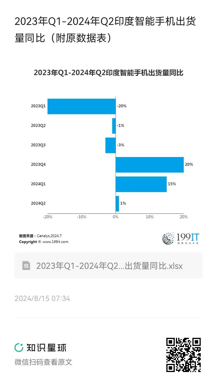 - 2023年Q1-2024年Q4印度智能手机出货量同比增长率(附原数据表)
