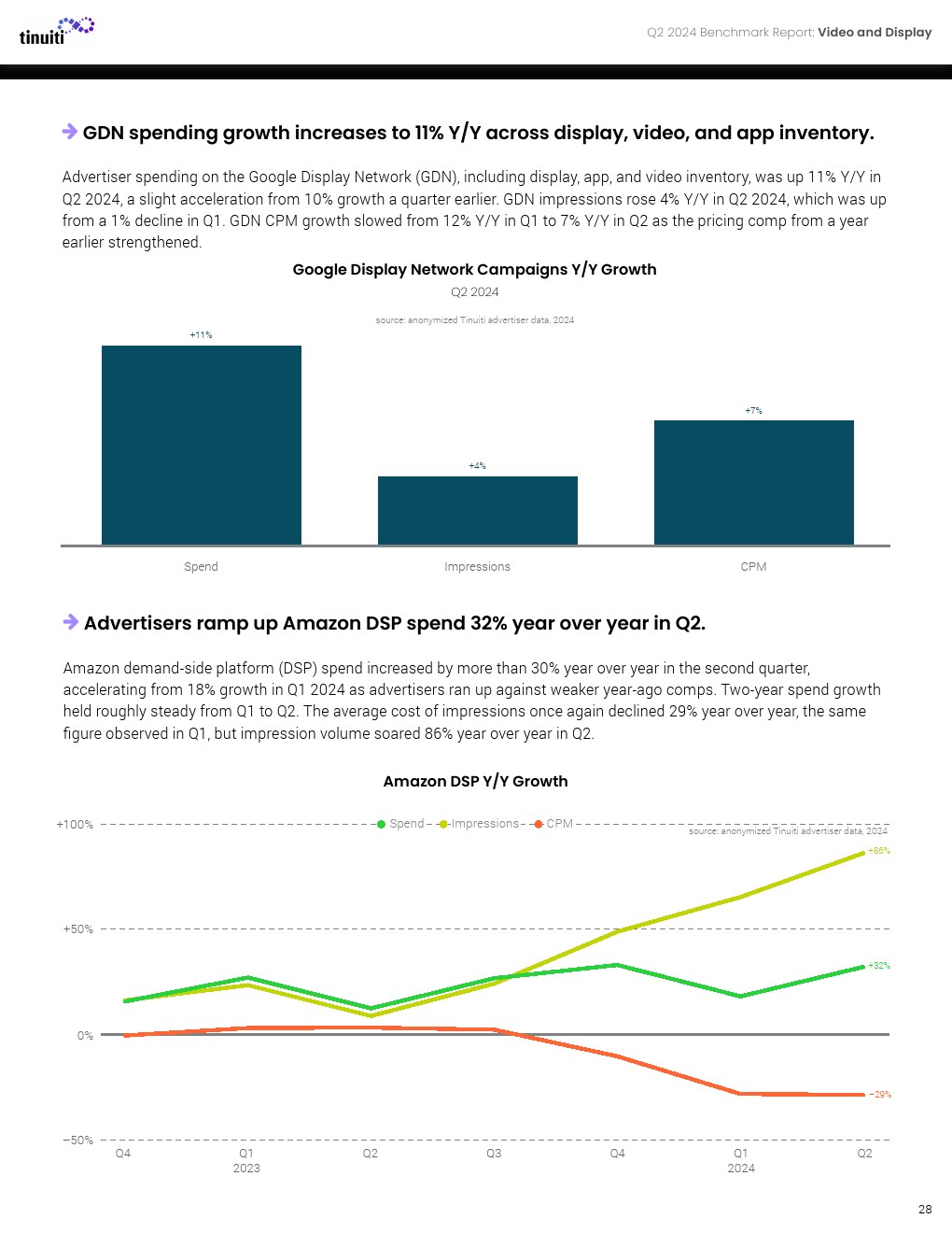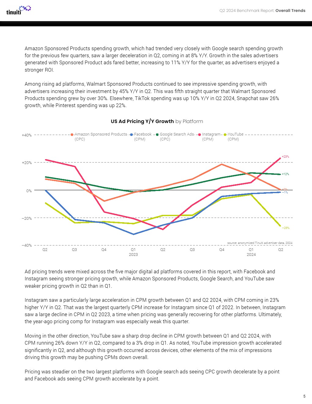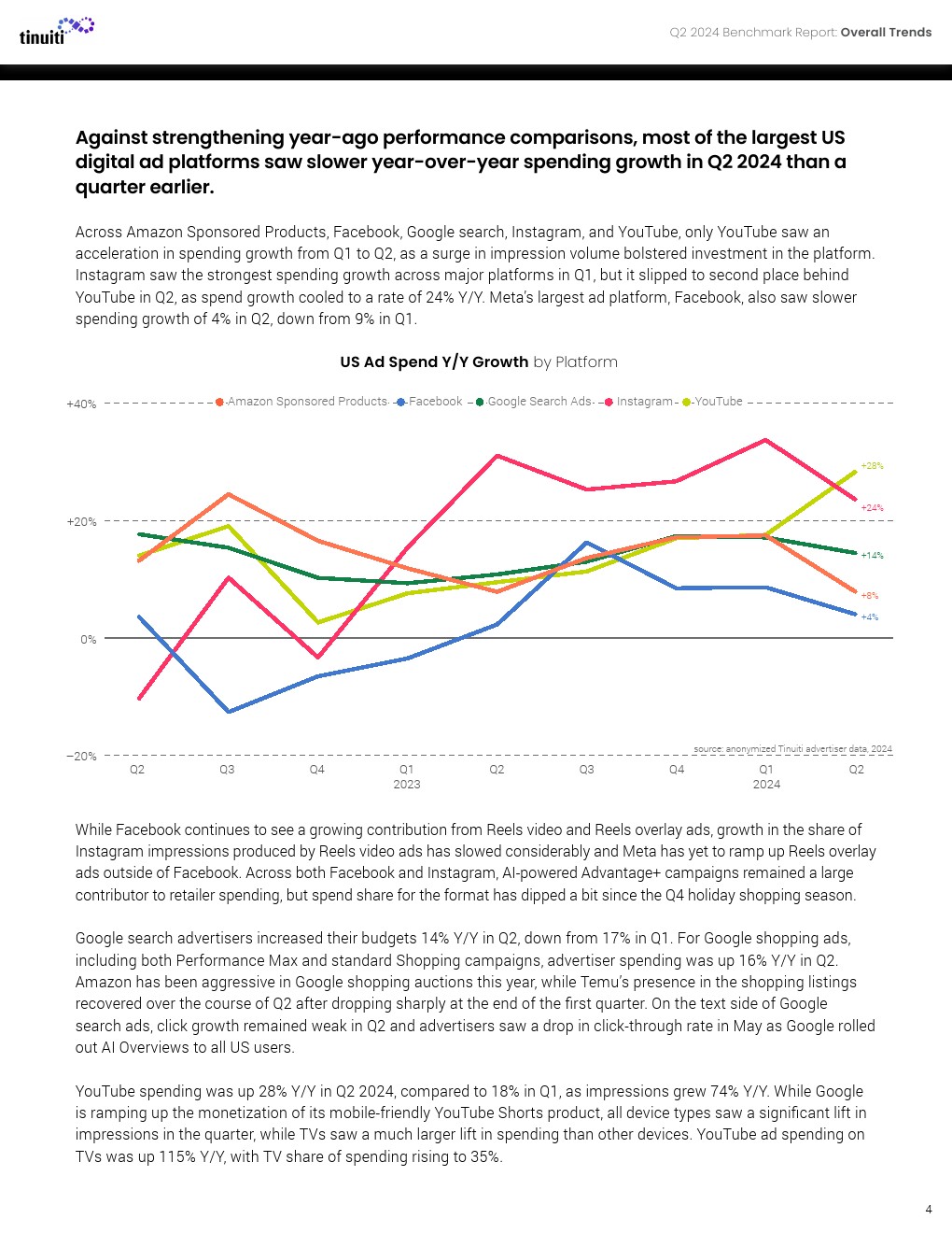 Tinuiti发布了“2024年第二季度网络广告报告”。与去年同期相比,大多数美国最大的数字广告平台在2024年第二季度的支出同比增长都低于上一季度。