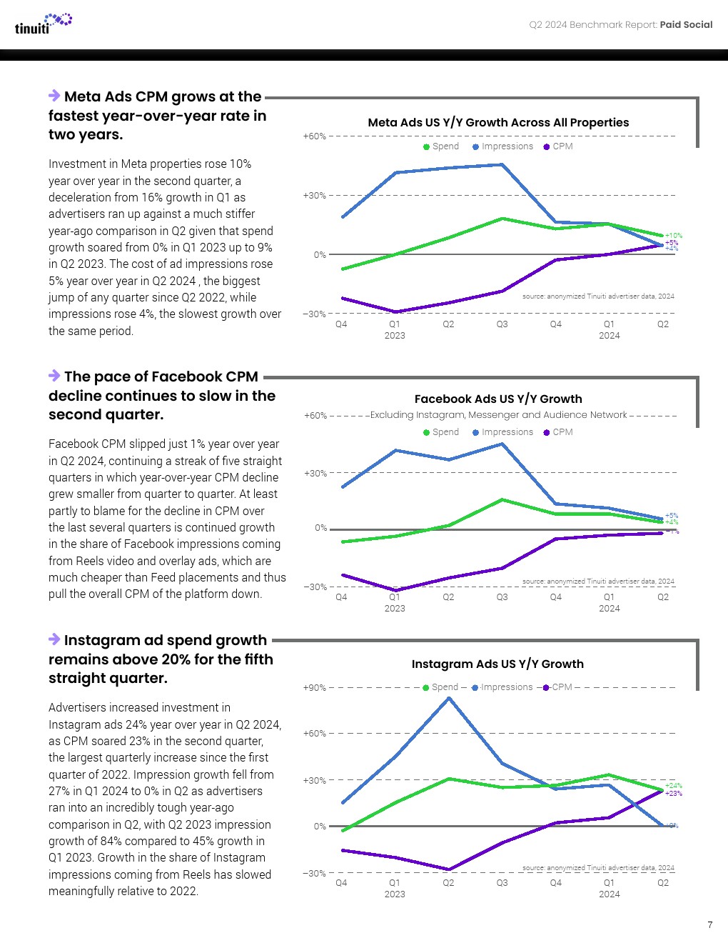 Instagram在2024年第一季度和第二季度的CPM增长特别快,第二季度的CPM同比增长了23%。