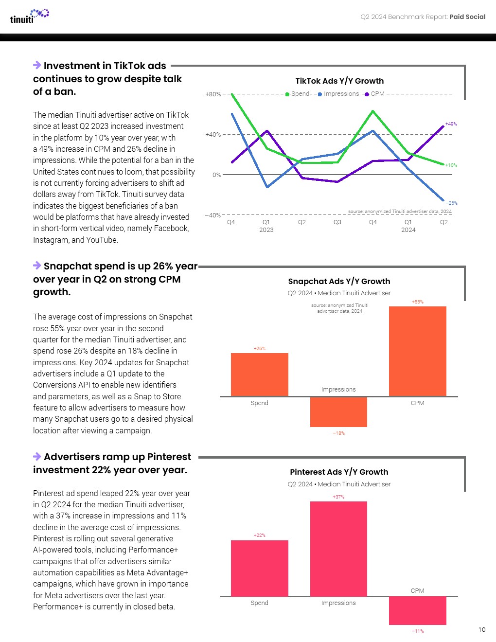 TikTok在2024年第二季度的广告支出同比增长了10%;Snapchat增长了26%;Pinterest的支出增长了22%。