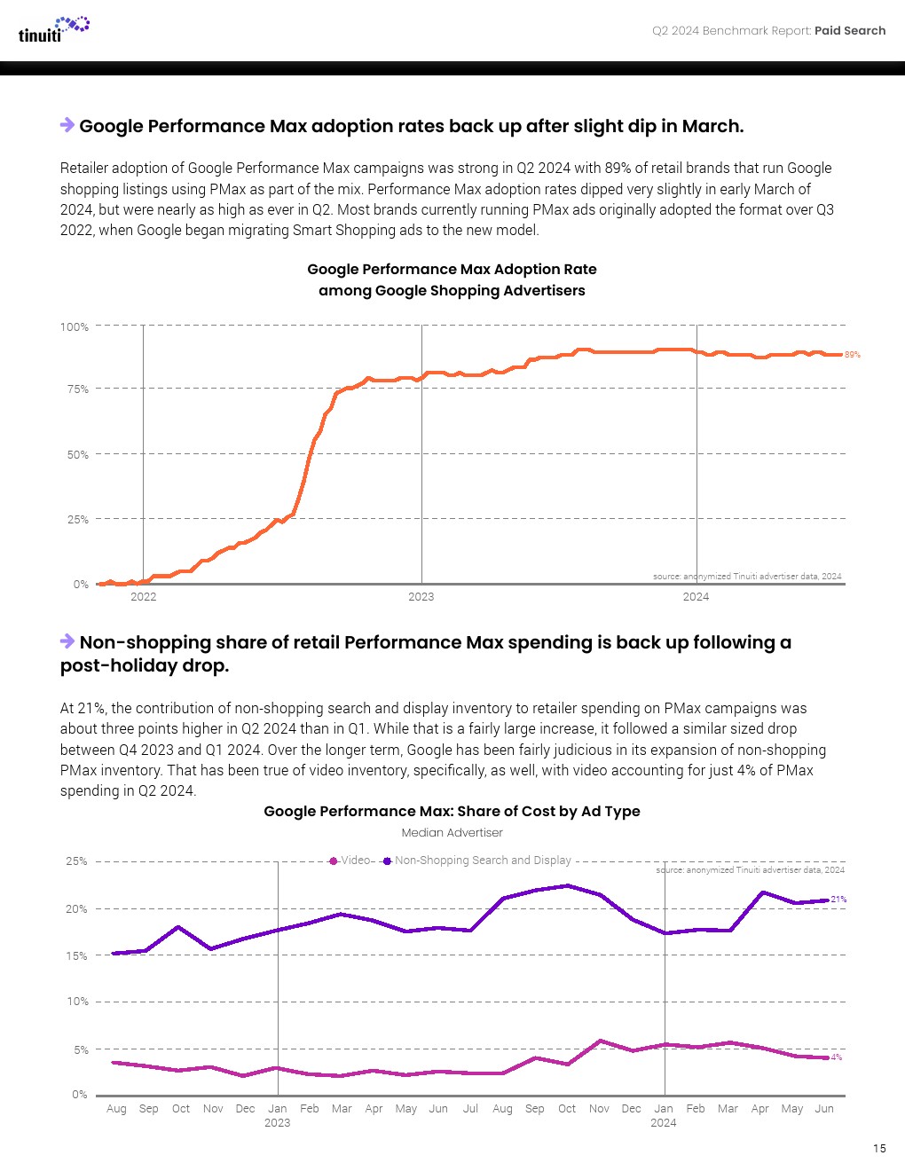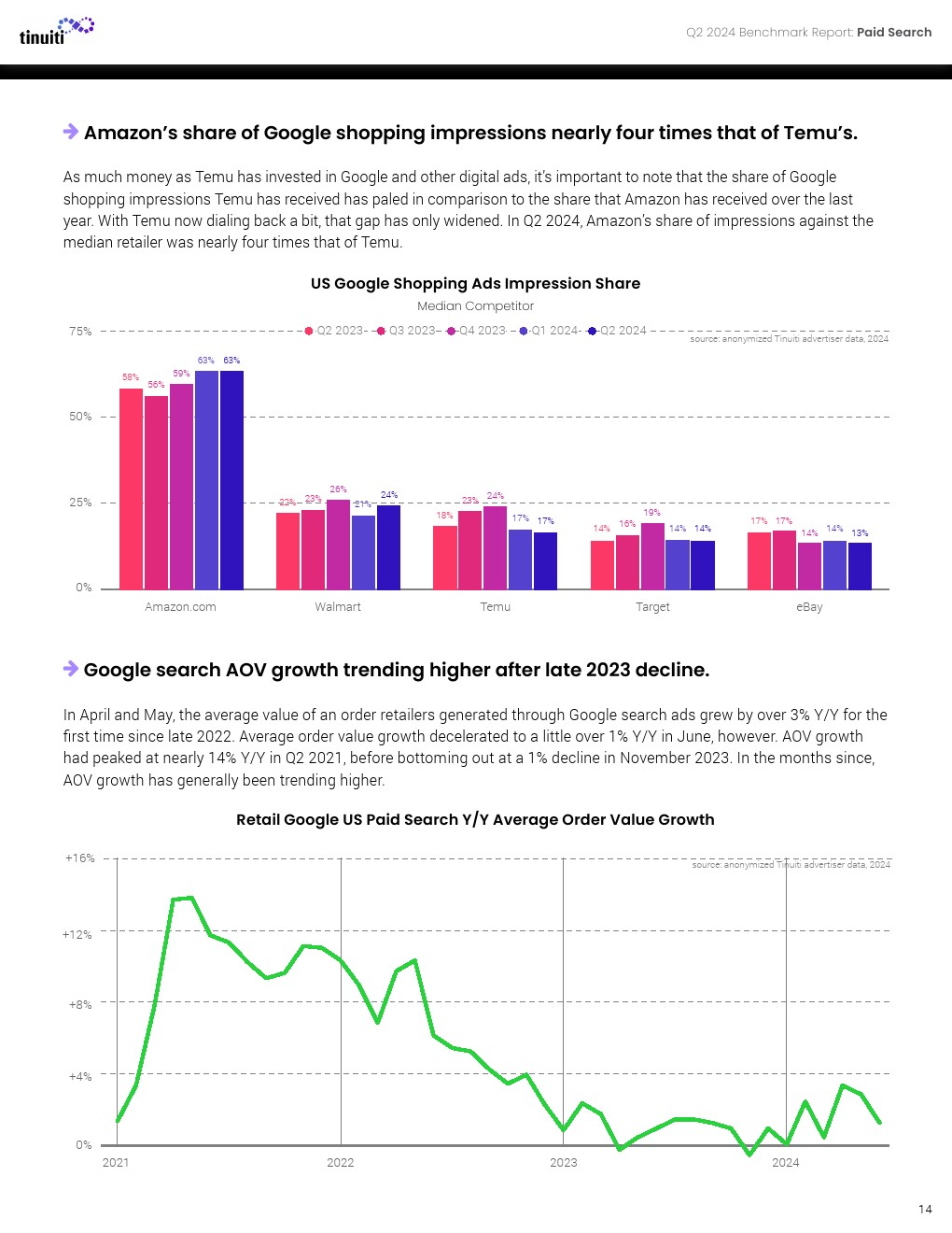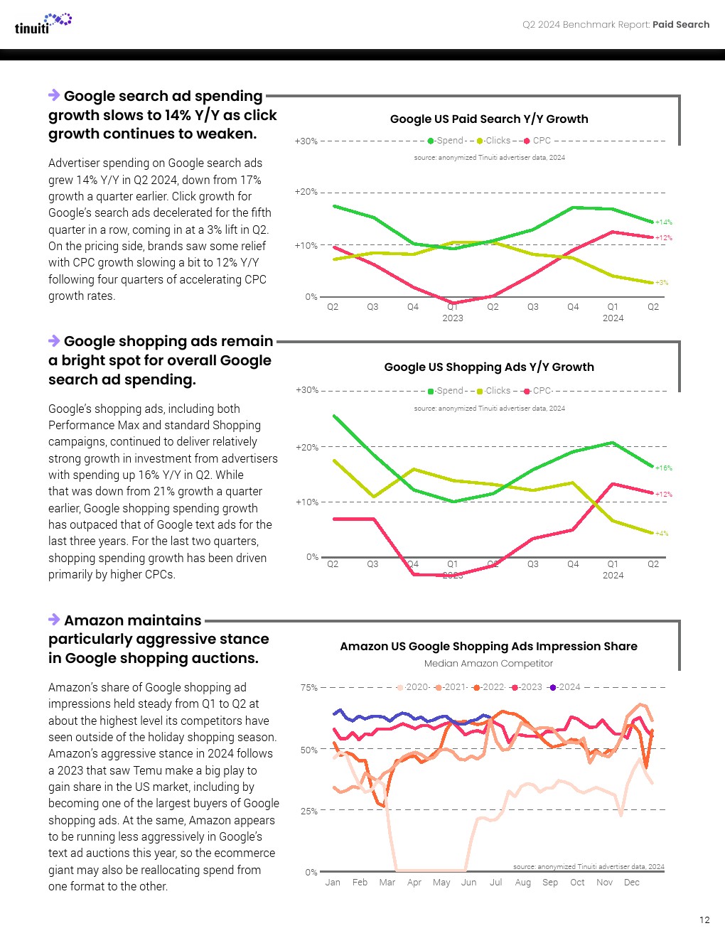 谷歌搜索广告客户第二季度的预算同比增长14%,低于第一季度的17%。对于谷歌购物广告,包括Performance Max和标准购物活动,第二季度广告客户支出同比增长16%。