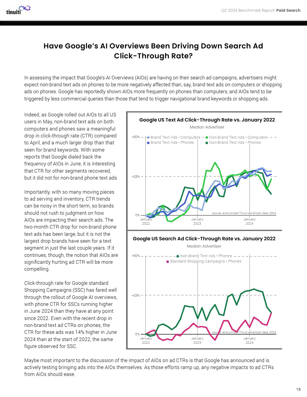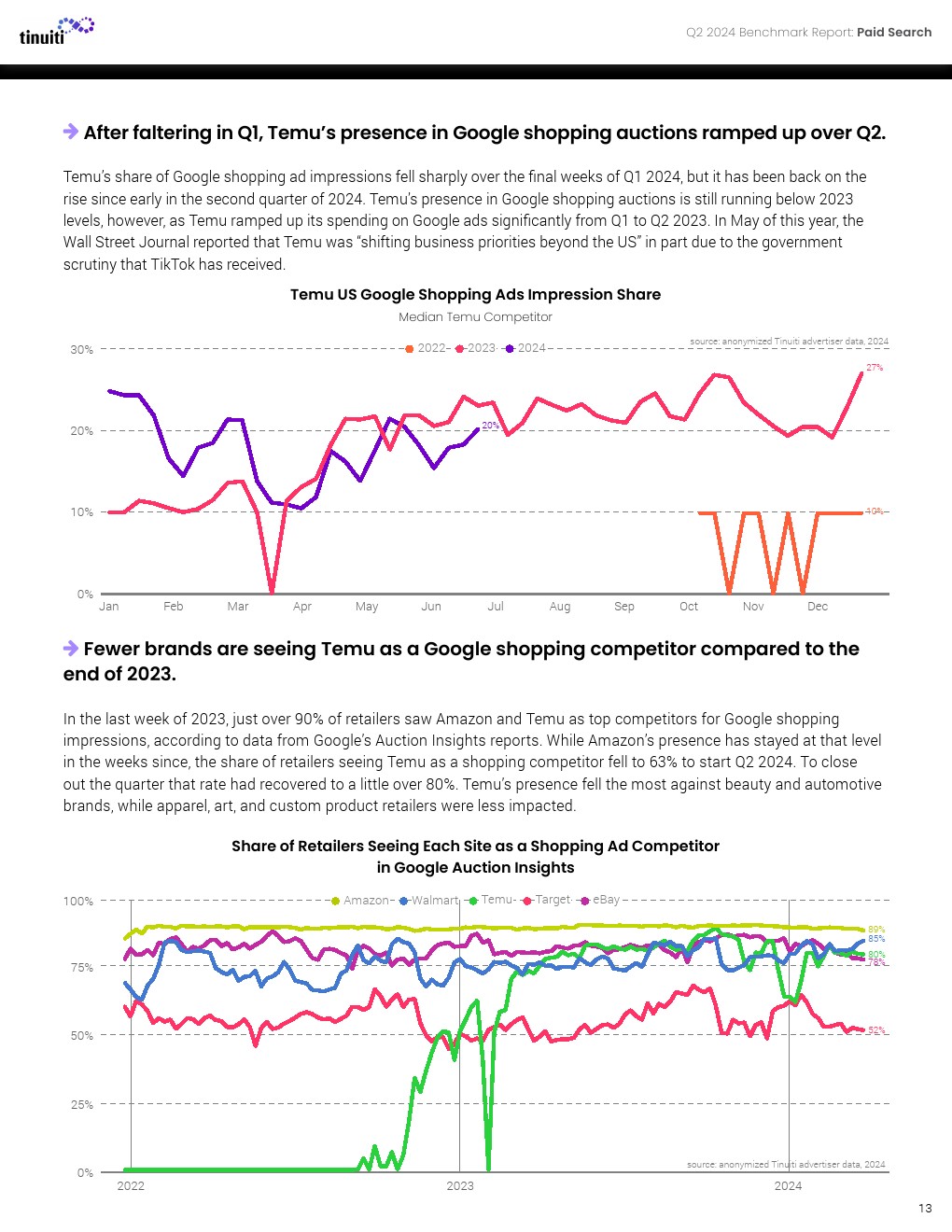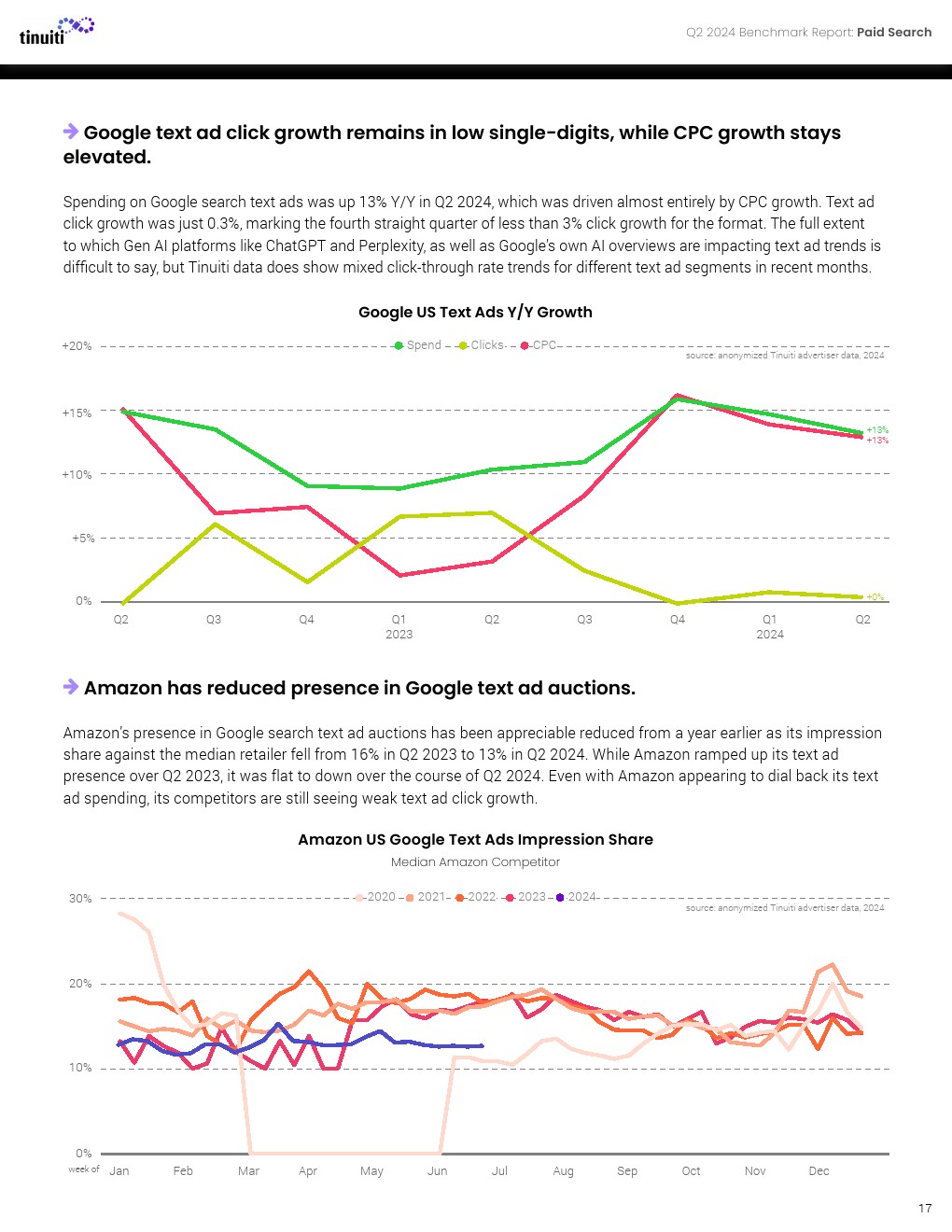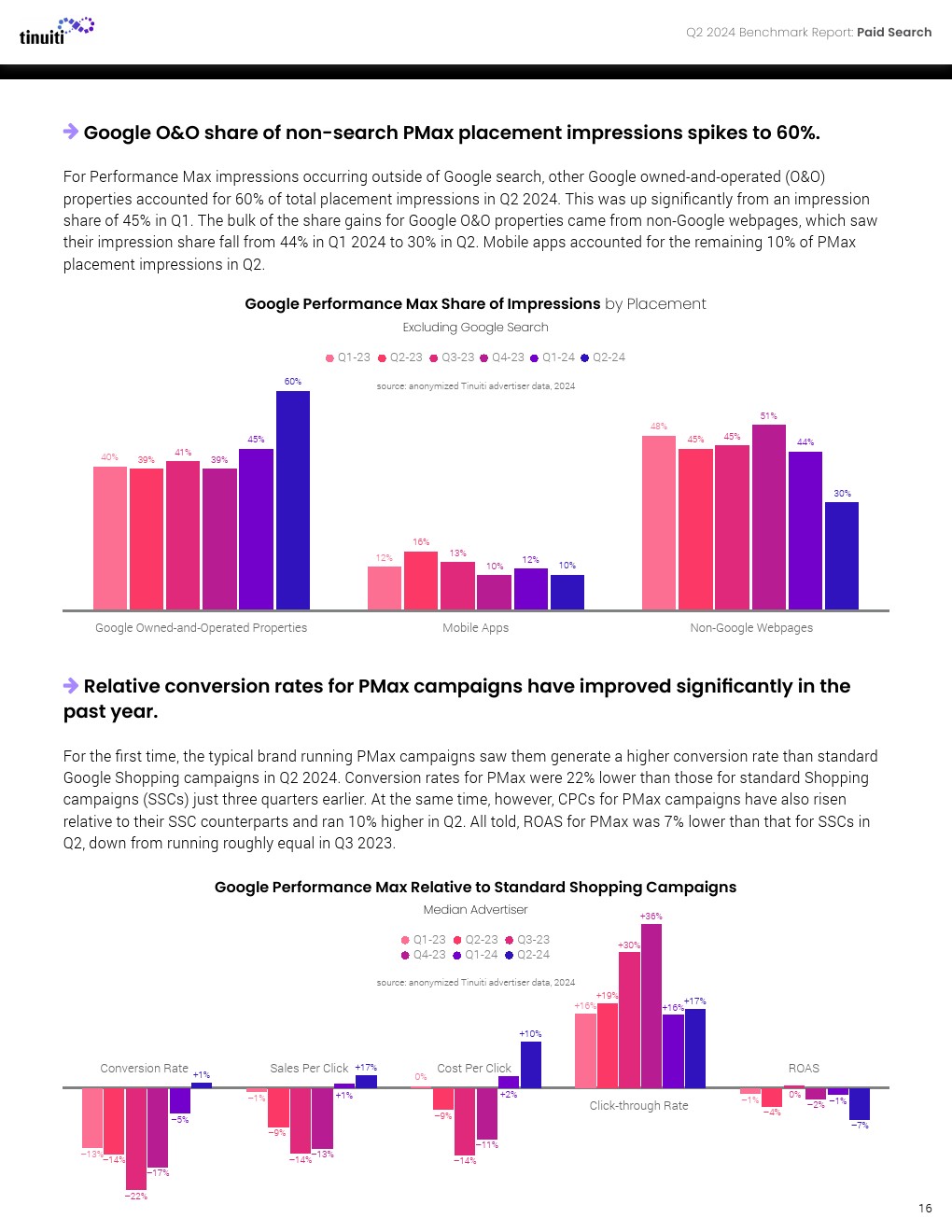 谷歌搜索广告客户第二季度的预算同比增长14%,低于第一季度的17%。对于谷歌购物广告,包括Performance Max和标准购物活动,第二季度广告客户支出同比增长16%。