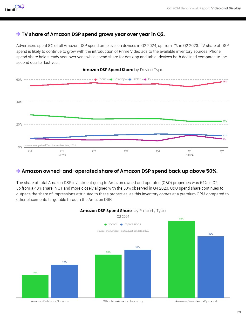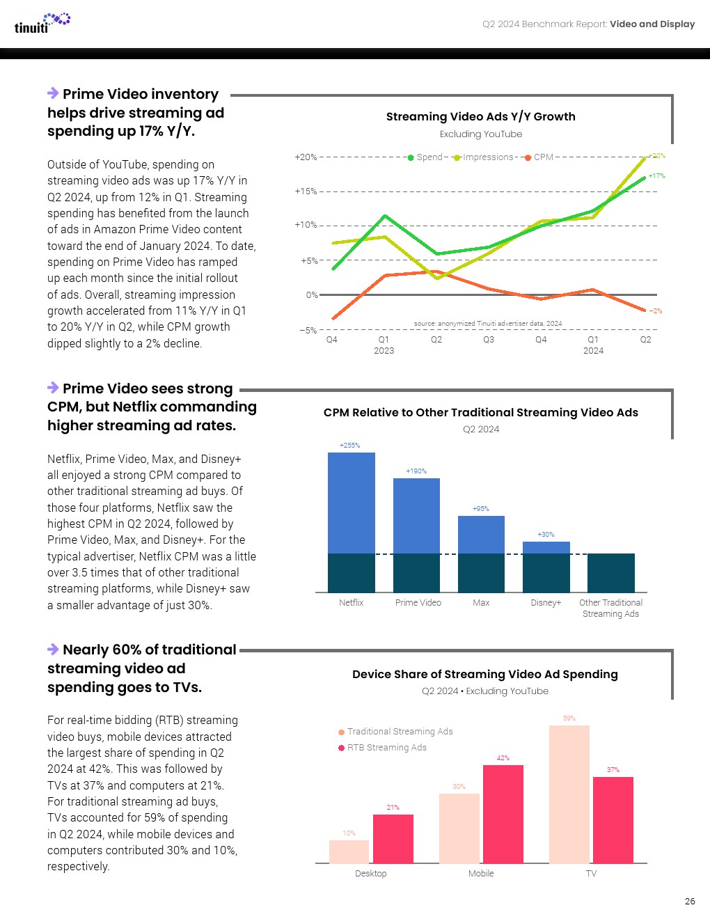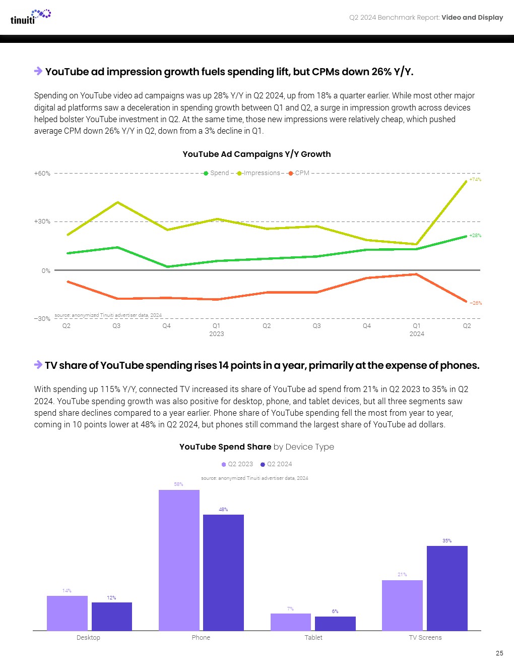YouTube在2024年第二季度的支出同比增长28%,而第一季度为18%,曝光率同比增长74%。YouTube的电视广告支出同比增长115%,其中电视广告支出占比升至35%。