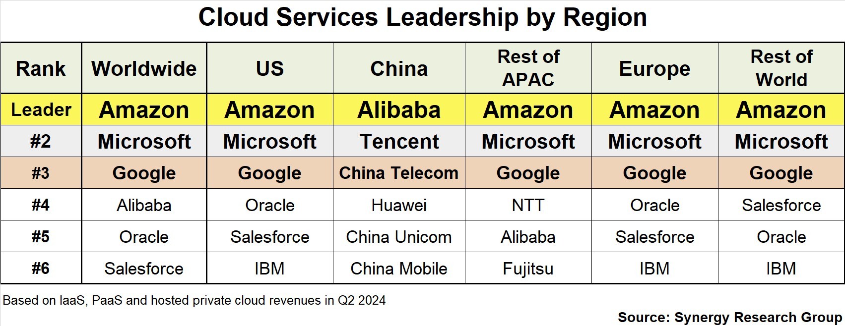 Synergy Research Group最新发布的第二季度数据显示,按季度收入计算,亚马逊(Amazon)、微软(Microsoft)和谷歌(Google)显然是全球云市场的领导者,市场份额分别为32%、23%和12%,而其他公司的市场份额都没有超过4%。在这三家公司之后是阿里巴巴、甲骨文和Salesforce。撇开中国不谈,所有主要地区的前三大云提供商排名都是一样的。除了前三名之外,各地区的排名确实略有变化,甲骨文(Oracle)、Salesforce、IBM和NTT通常都在争夺位置。然而,前三名的共性表明了云市场真正的全球性。要成为市场领导者,需要庞大的规模、雄厚的资金、不断的技术创新、全球品牌、超大规模基础设施的全球网络,以及长期的企业承诺和专注。对于任何想要挑战云计算领导地位的品牌来说,这都是主要的障碍。