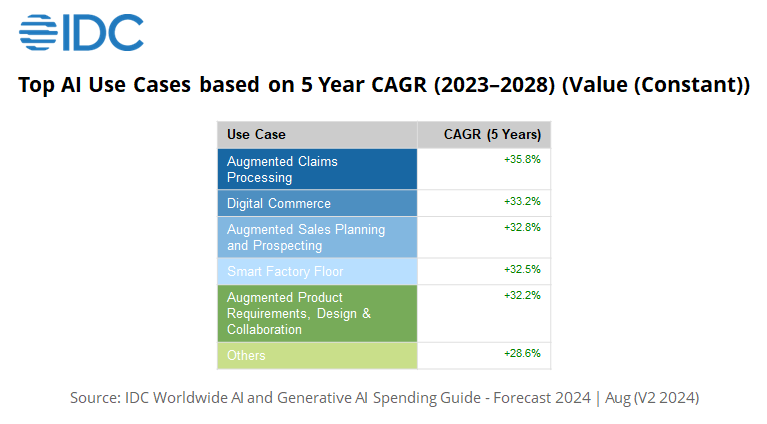 在大多数预测中,人工智能基础设施配置将成为人工智能解决方案的主要用例,然而在支出指南中包含的用例中预计增长率最低(复合年增长率为14.7%),IDC预计到2028年其他几个用例将赶上或超过它。这些用例包括增强欺诈分析和调查以及支持人工智能的客户服务和自助服务。支出增长最快的用例将是增强索赔处理(复合年增长率35.8%)和数字商务(复合年增长率33.2%)。在支出指南中确定的42个人工智能用例中预计有30个的五年复合年增长率将超过30%。