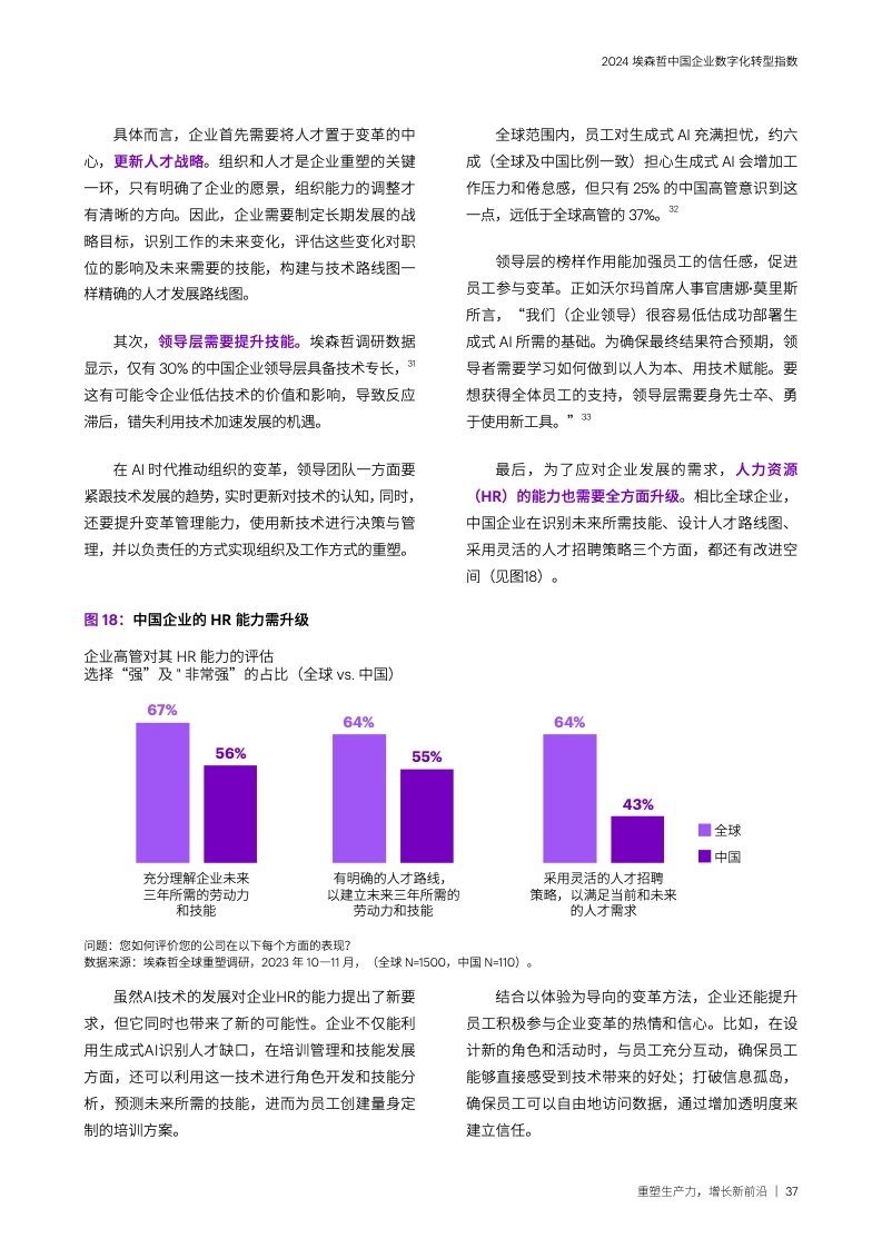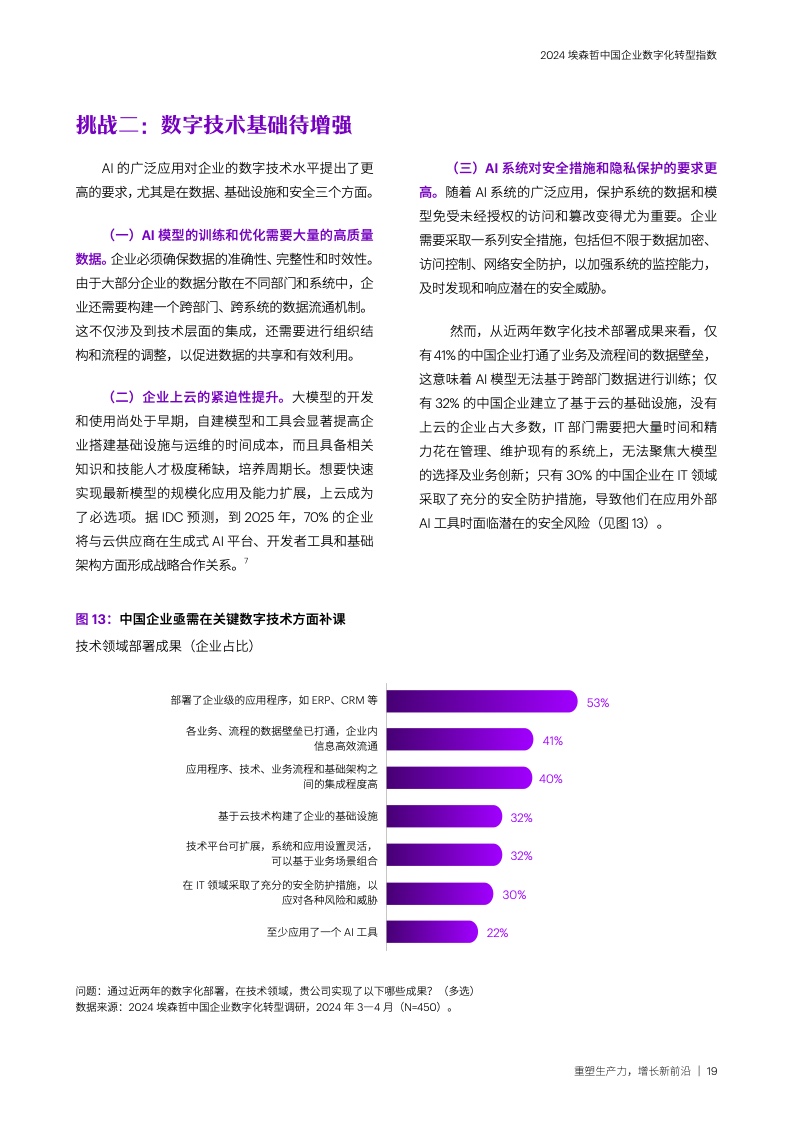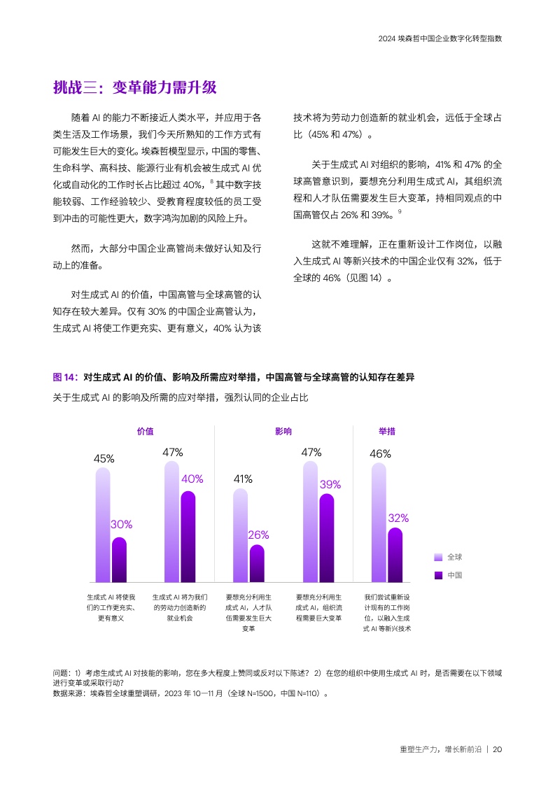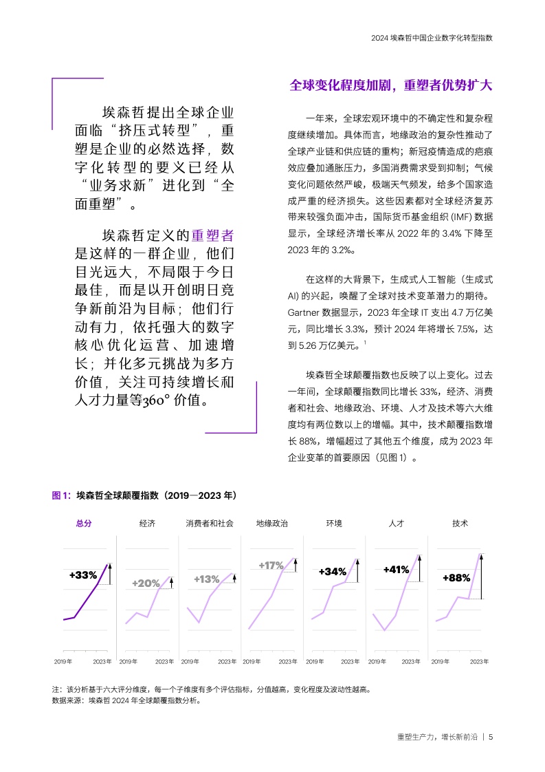 埃森哲全球颠覆指数也反映了以上变化。过去 一年间,全球颠覆指数同比增长 33%,经济、消费 者和社会、地缘政治、环境、人才及技术等六大维 度均有两位数以上的增幅。其中,技术颠覆指数增 长 88%,增幅超过了其他五个维度,成为 2023 年 企业变革的首要原因。