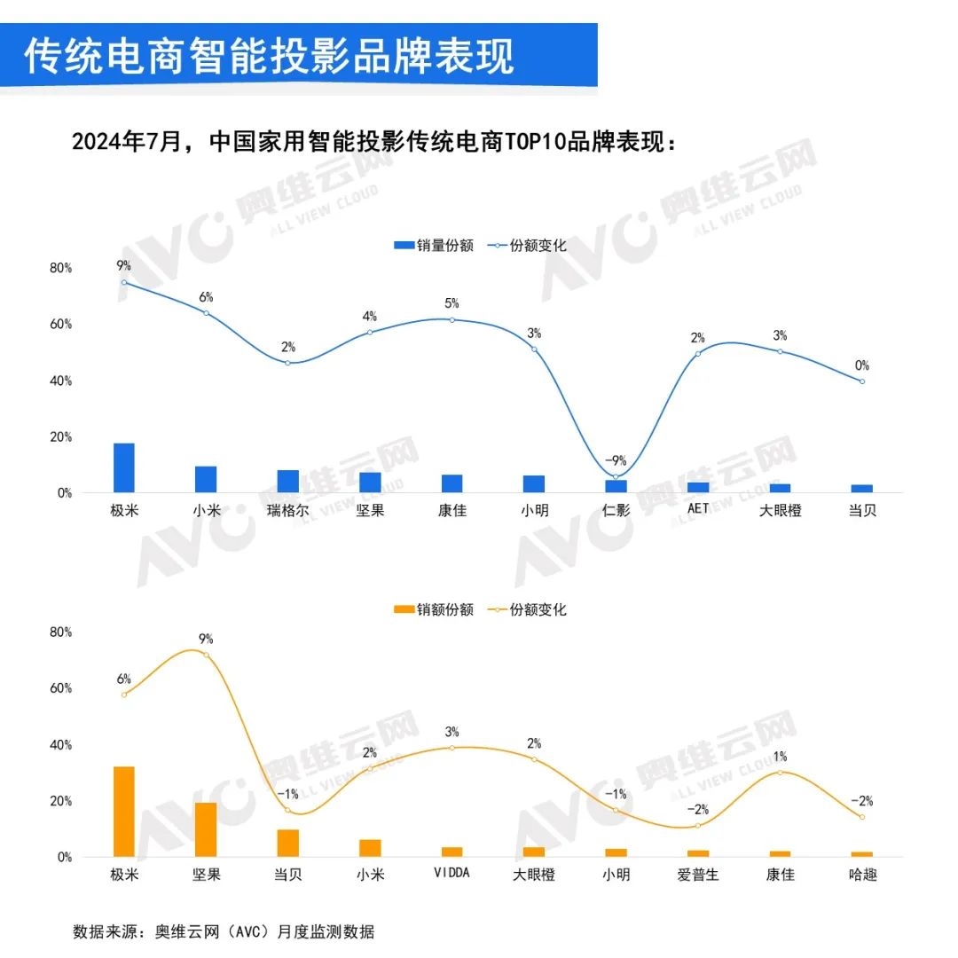 就品牌表现而言,极米、小米和瑞格尔在线上传统电商平台零售量的TOP3品牌榜上占据一席之地,其市场份额相比去年同期均有所上升。