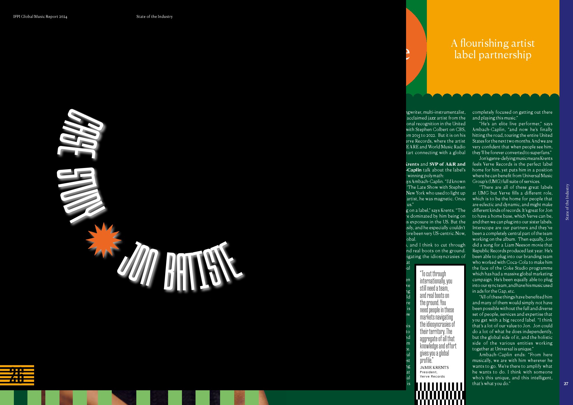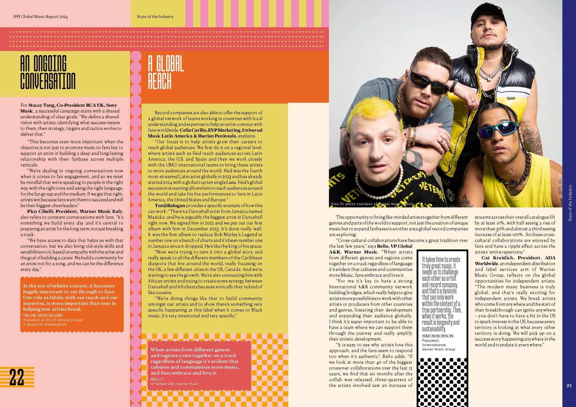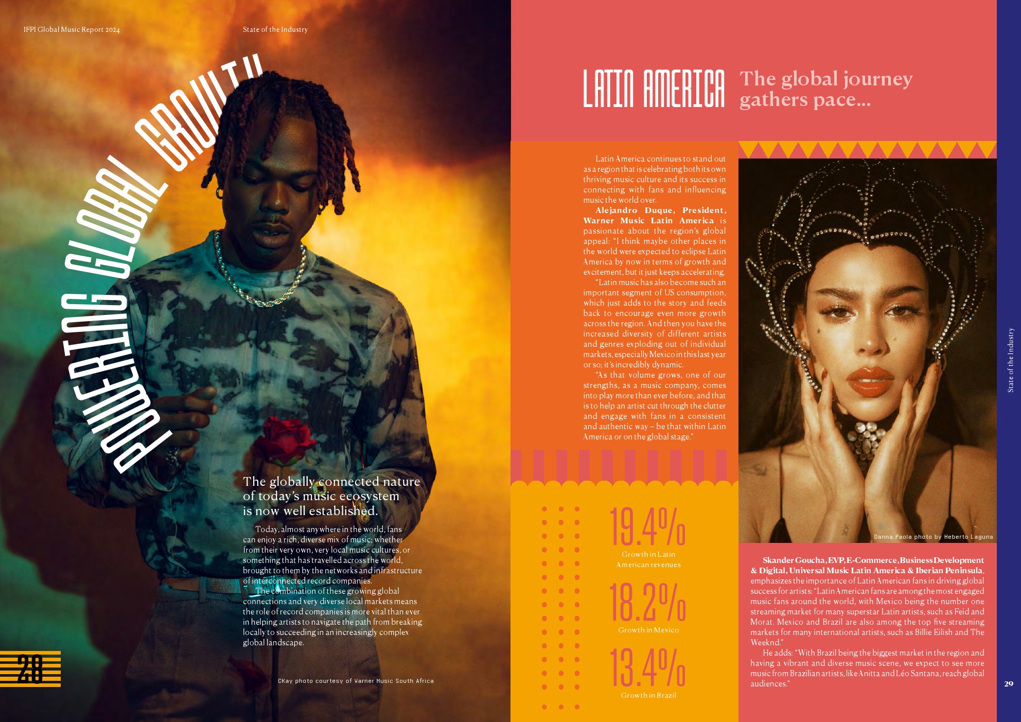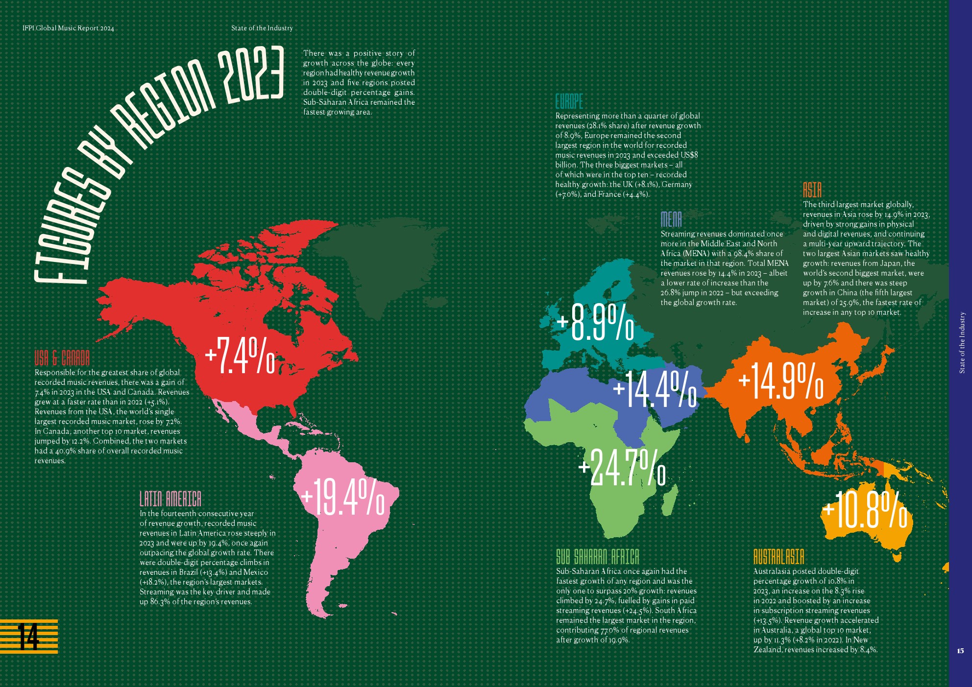 在连续第14年的收入增长中,拉丁美洲的录制音乐收入在2023年大幅增长19.4%。该地区最大的市场巴西(+13.4%)和墨西哥(+18.2%)的营收出现了两位数的增长。流媒体是主要动力,占该地区收入的86.3%。