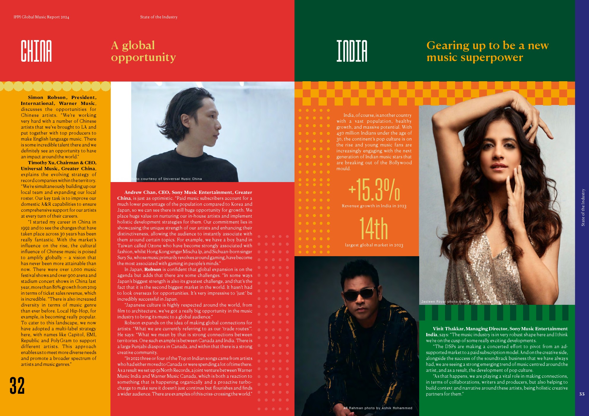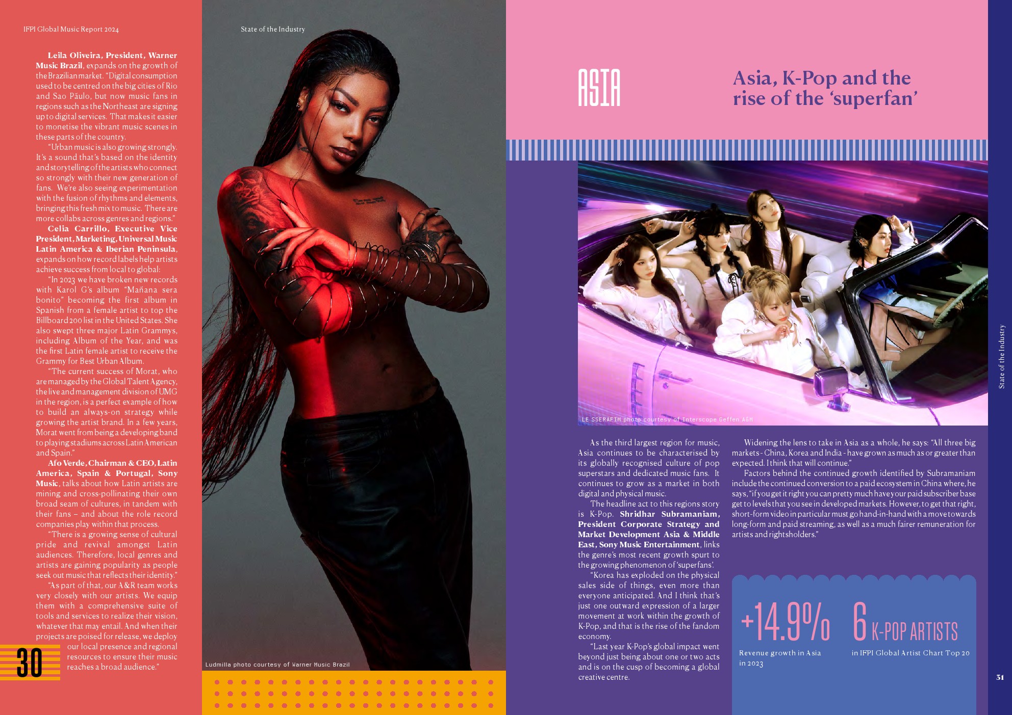 作为全球第三大地区,在实体和数字收入强劲增长的推动下,亚洲音乐收入在2023年增长了14.9%,并延续了多年的上升趋势。世界第二大市场日本的收入增长了7.6%,中国(第五大市场)的收入增长了25.9%,是前十大市场中增长最快的。