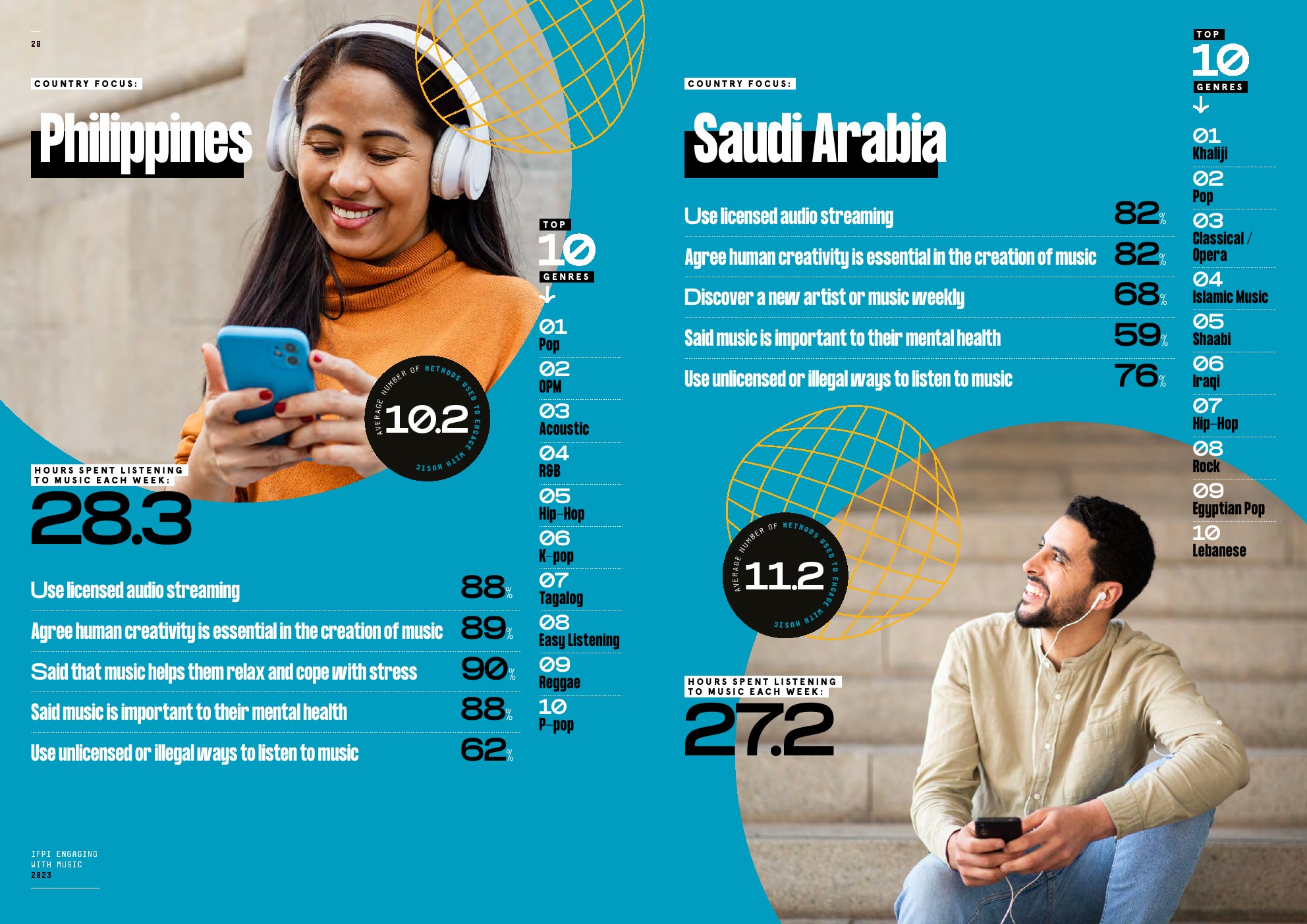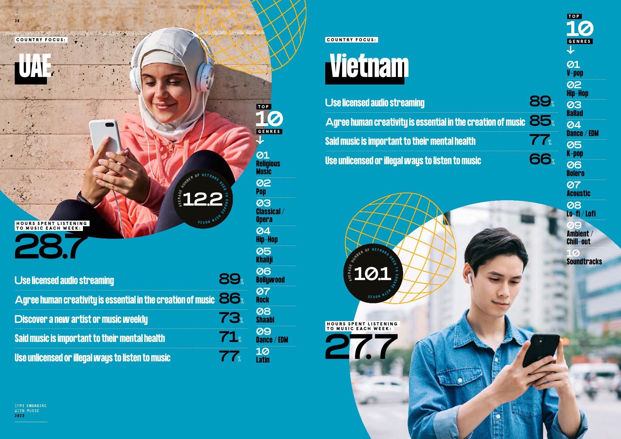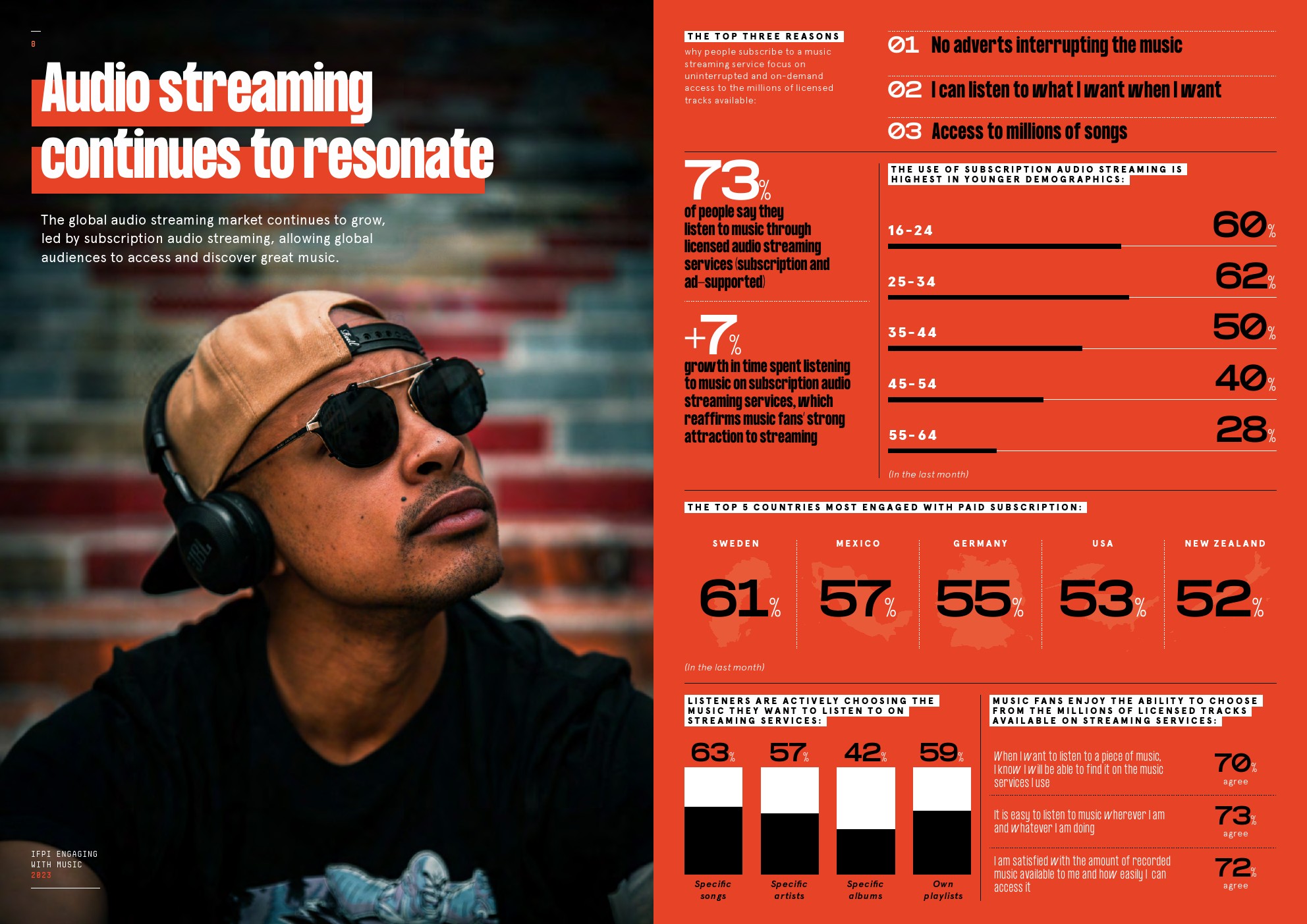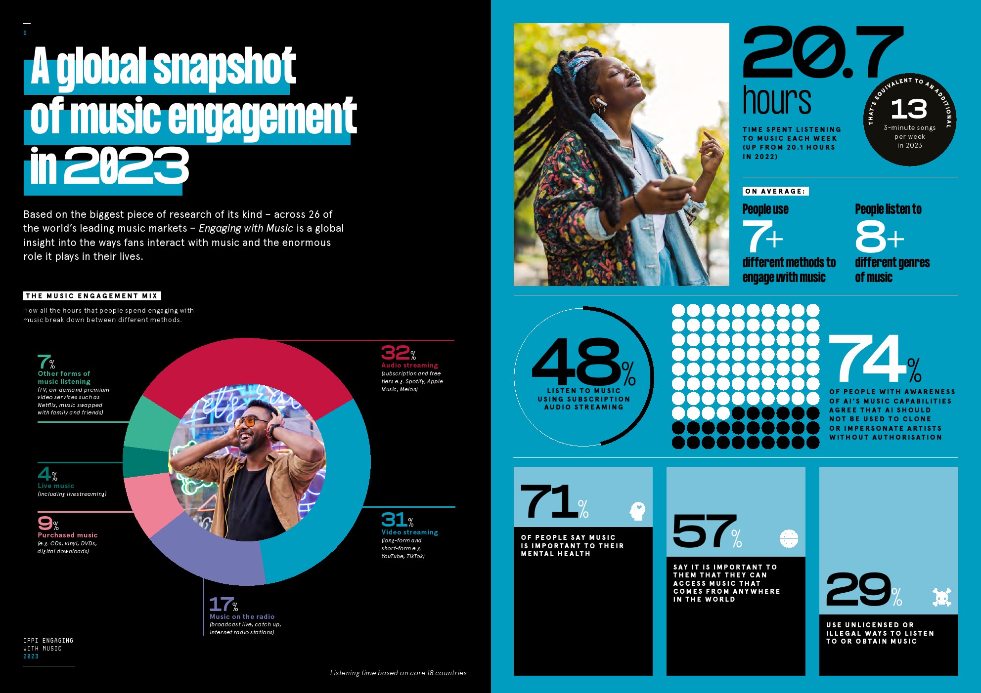 人们平均每周花在听音乐上的时间达到20.7小时(高于2022年的20.1小时)。这相当于在2023年每周多听13首3分钟的歌曲。