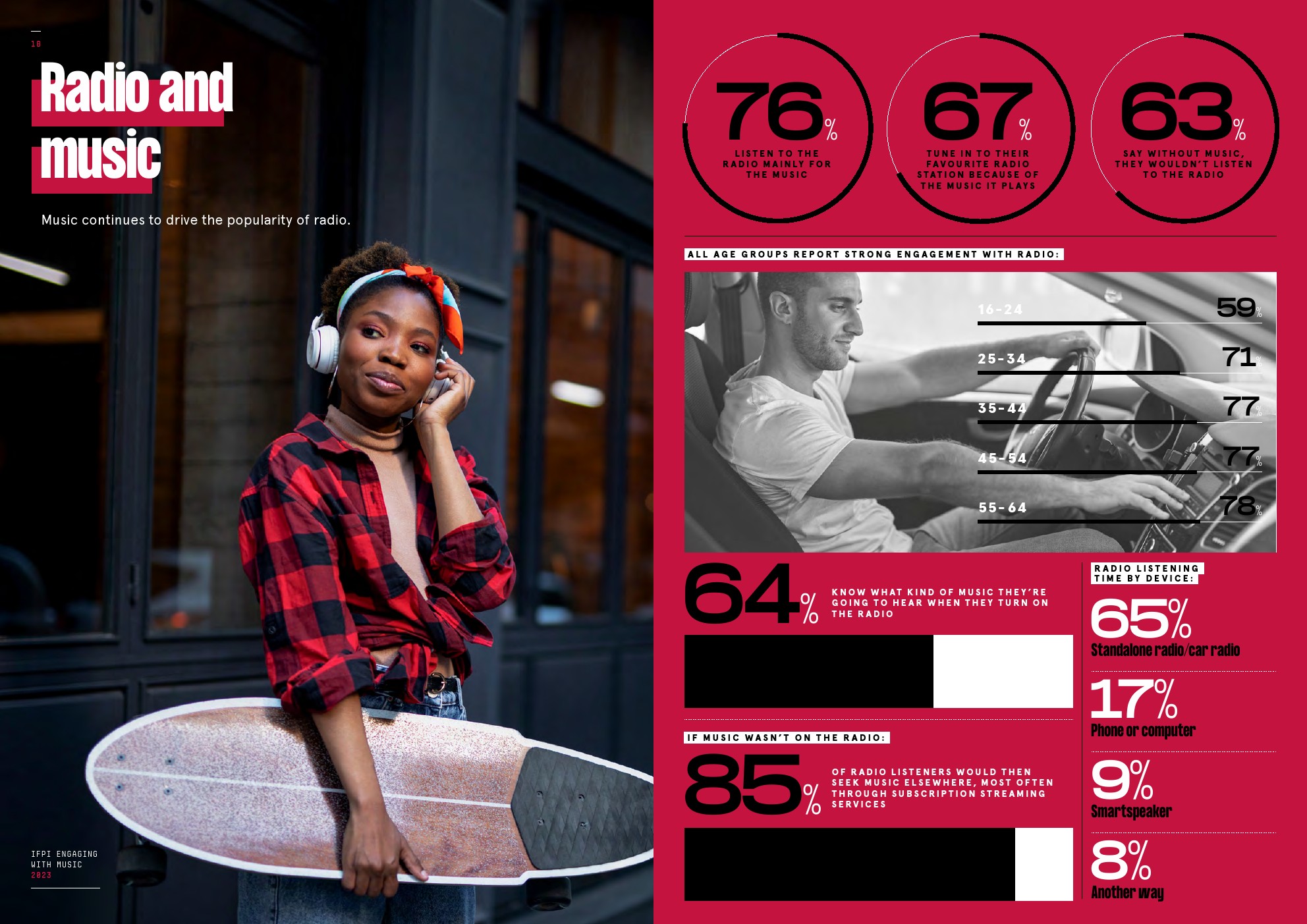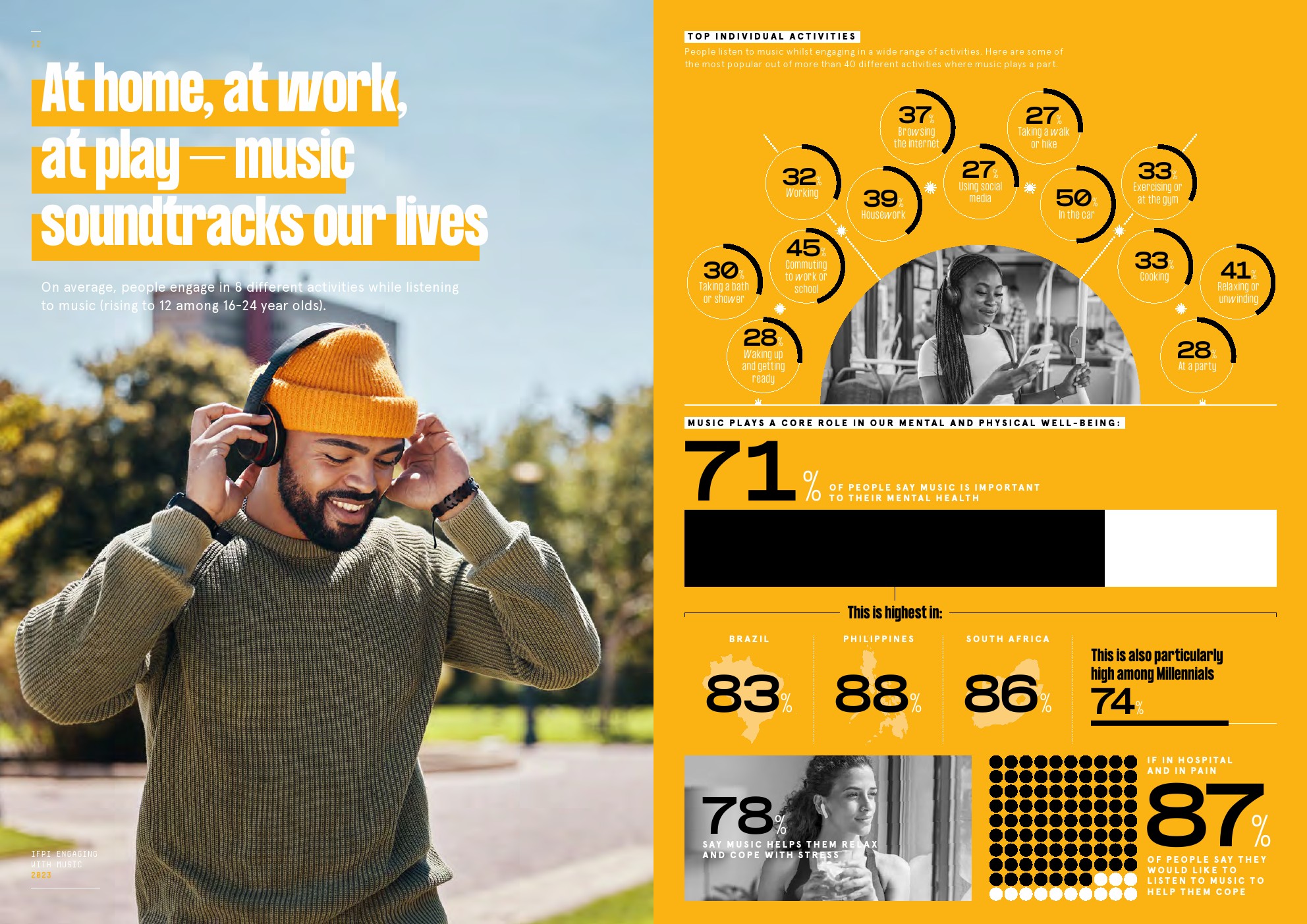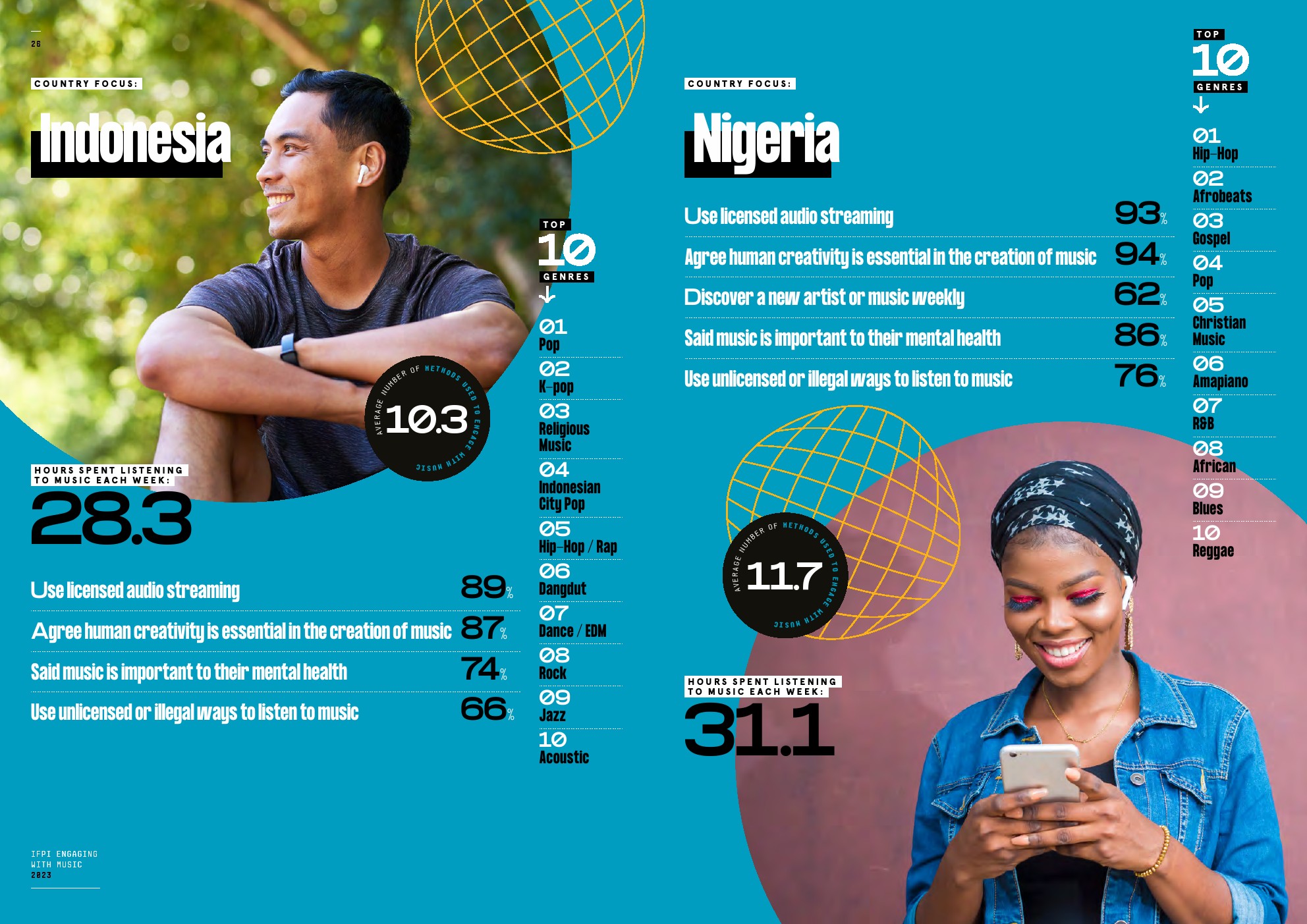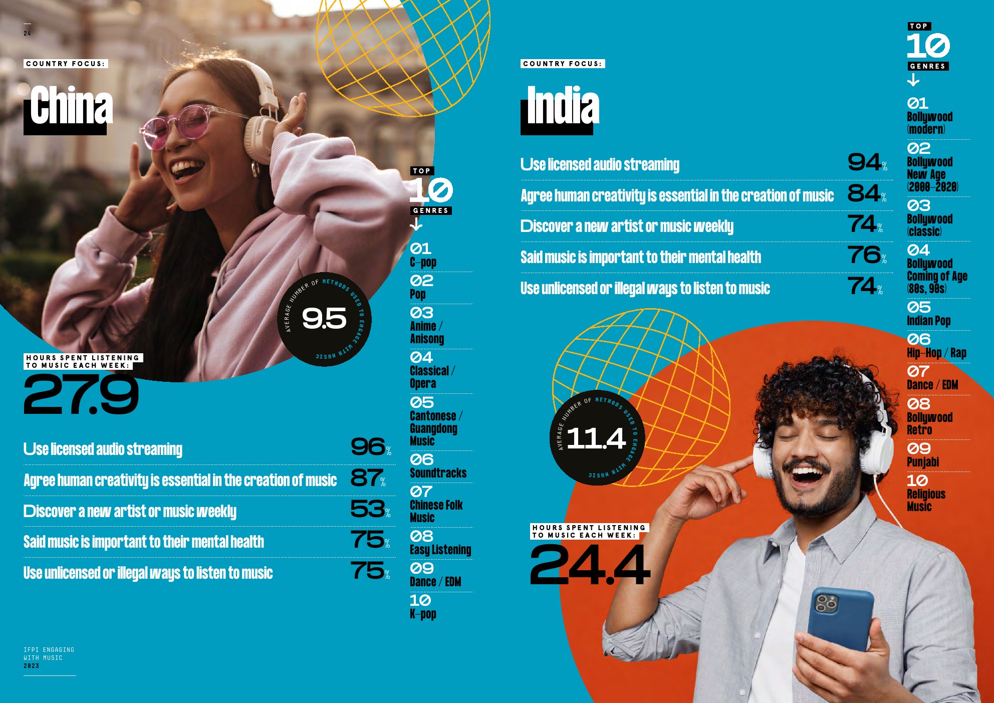 人们平均每周花在听音乐上的时间达到20.7小时(高于2022年的20.1小时)。这相当于在2023年每周多听13首3分钟的歌曲。