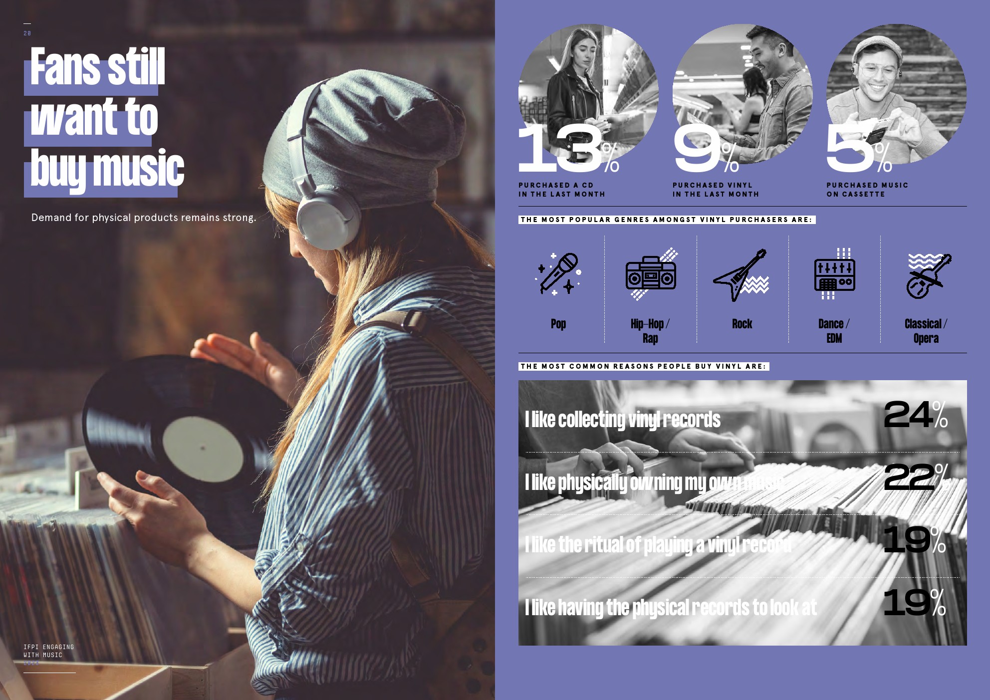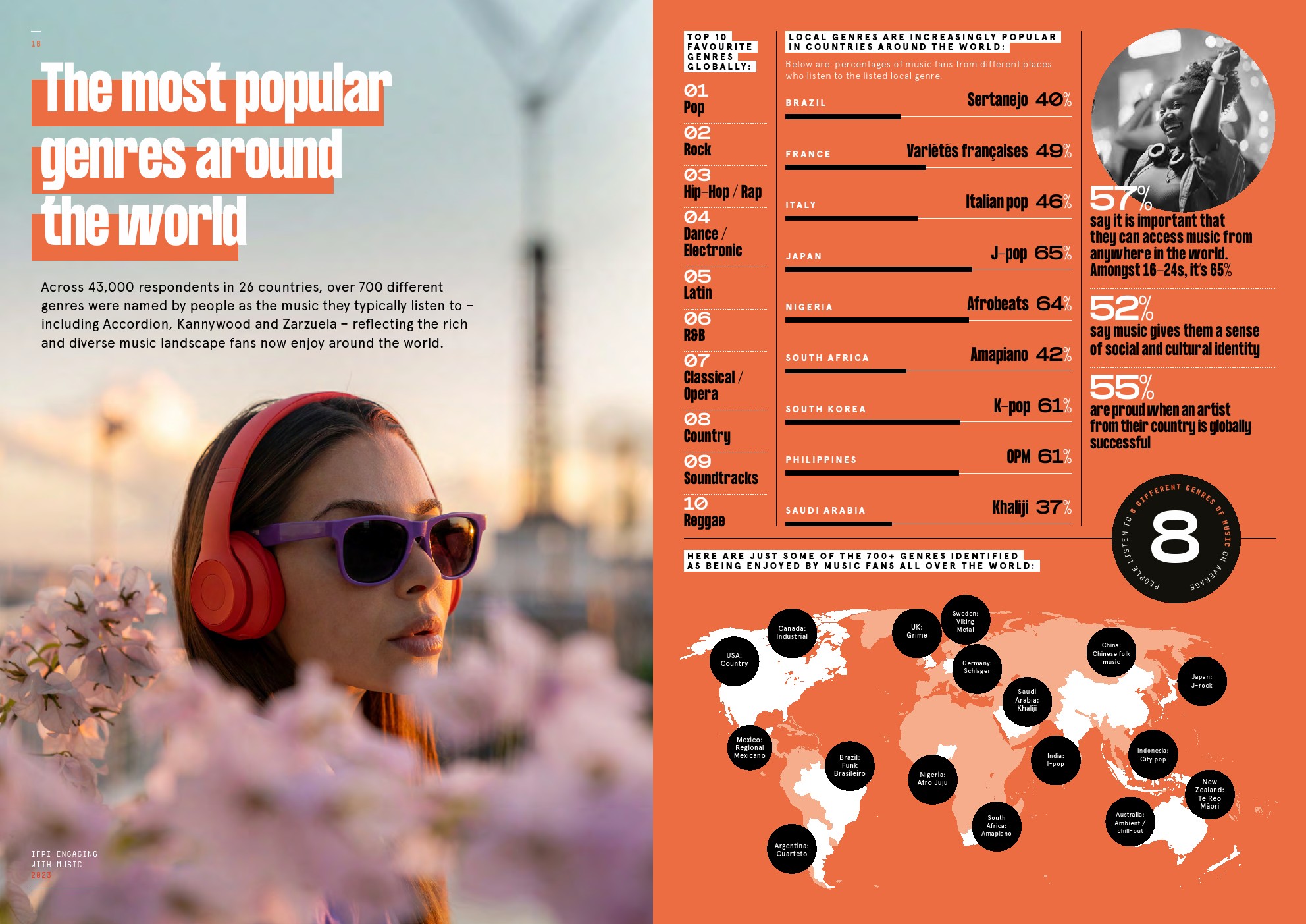57%的人表示,可以从世界上任何地方获得音乐对他们来说很重要。在16-24岁的人群中,这一比例为65%。平均而言,全世界的乐迷听了超过8种不同流派的音乐。