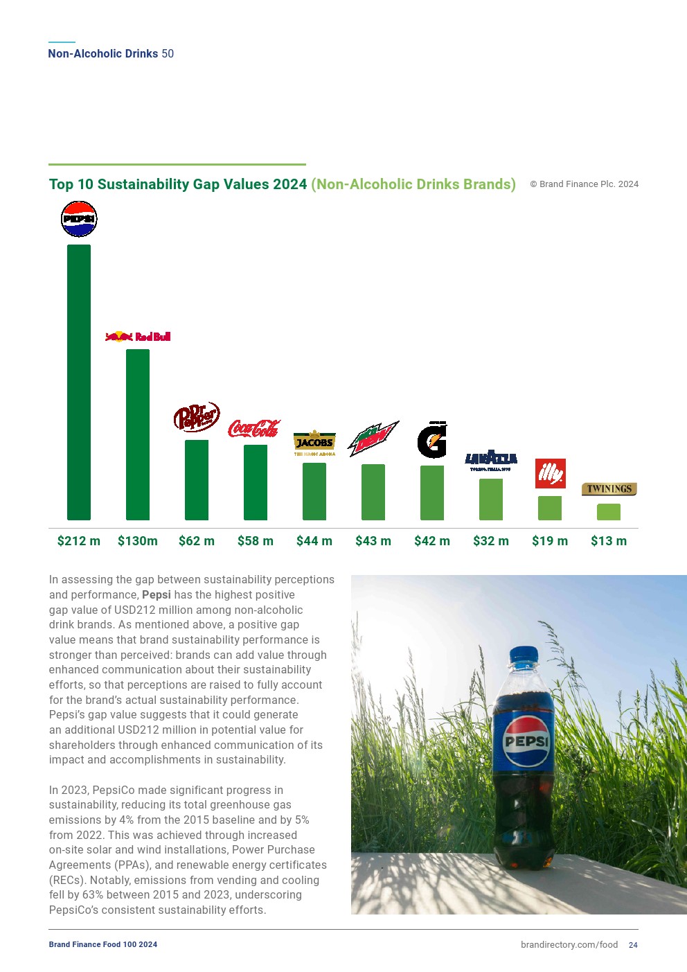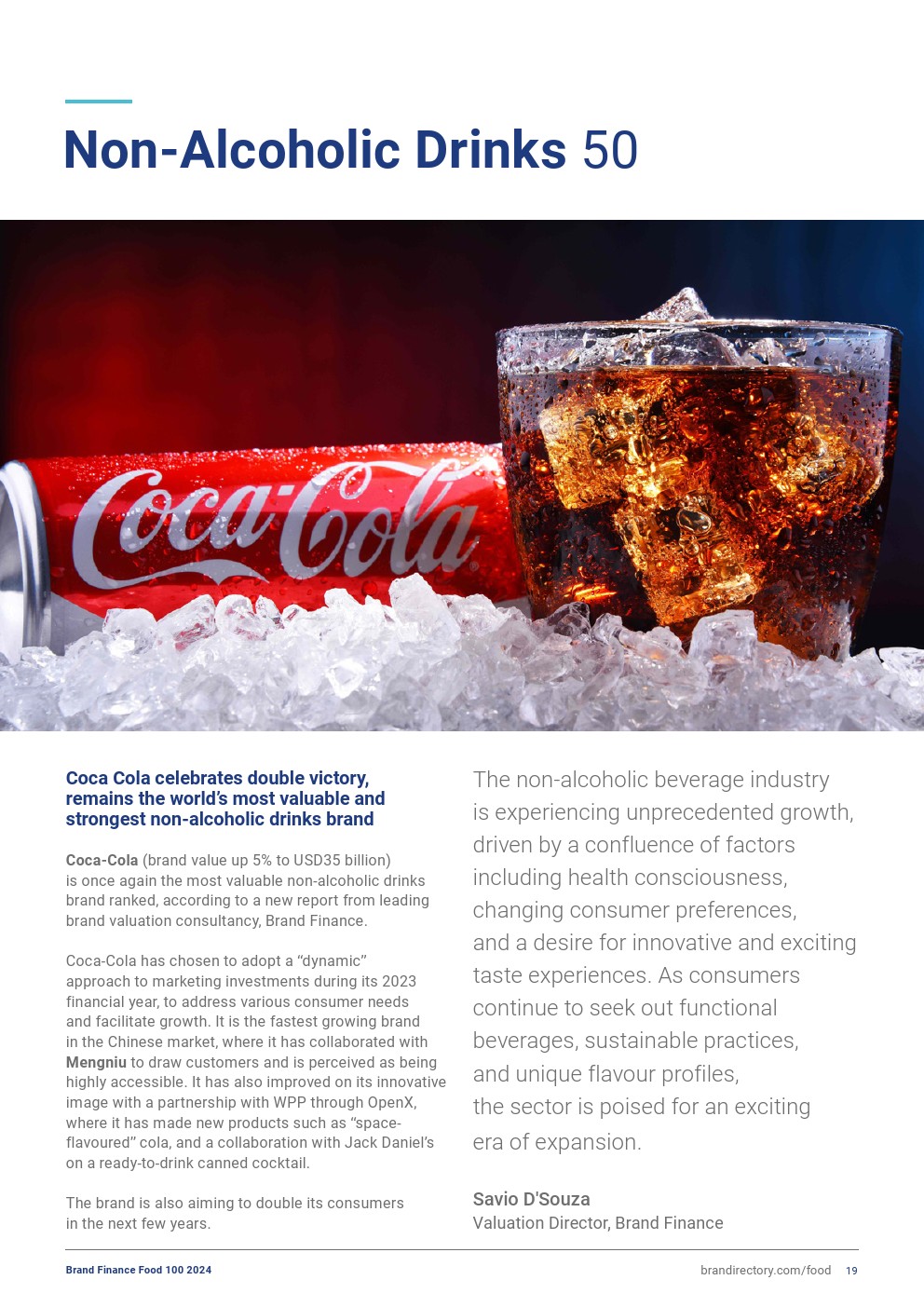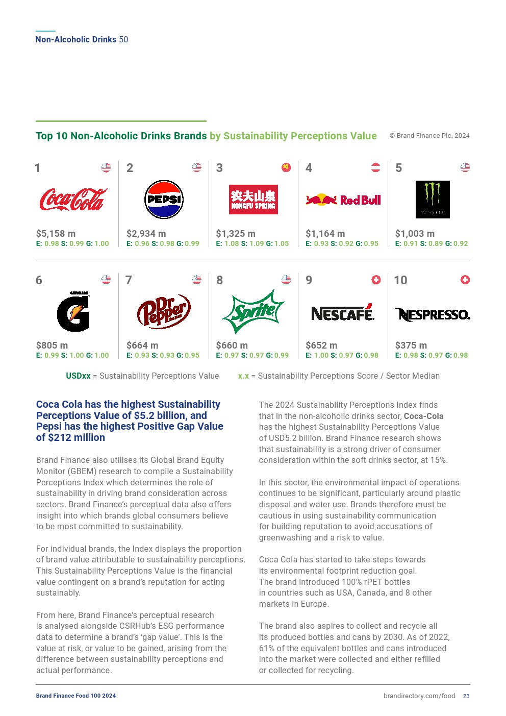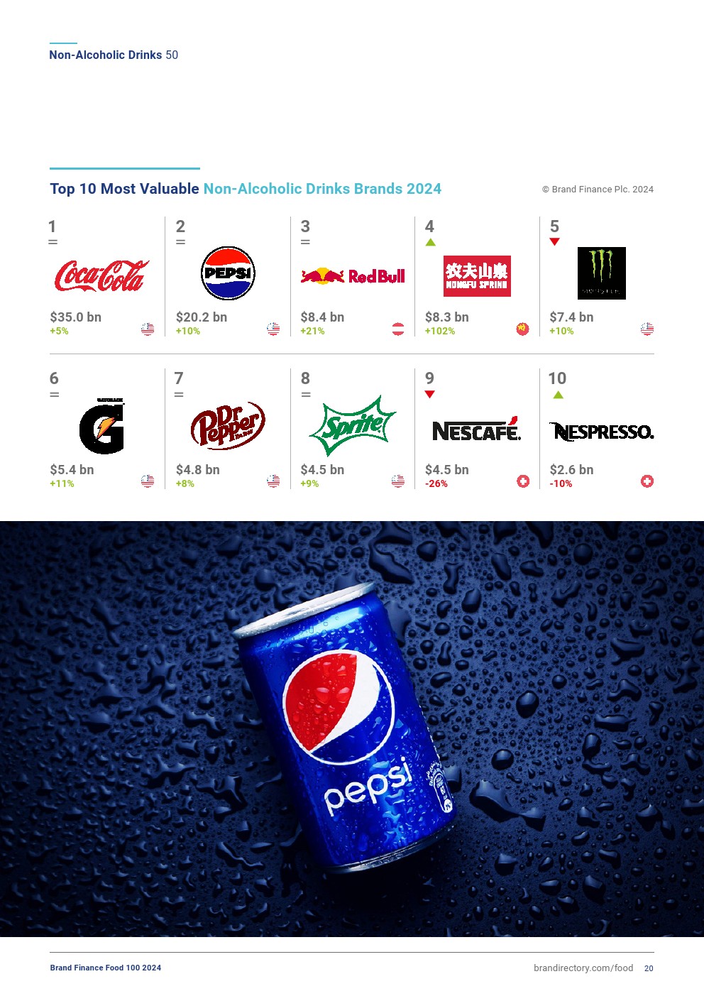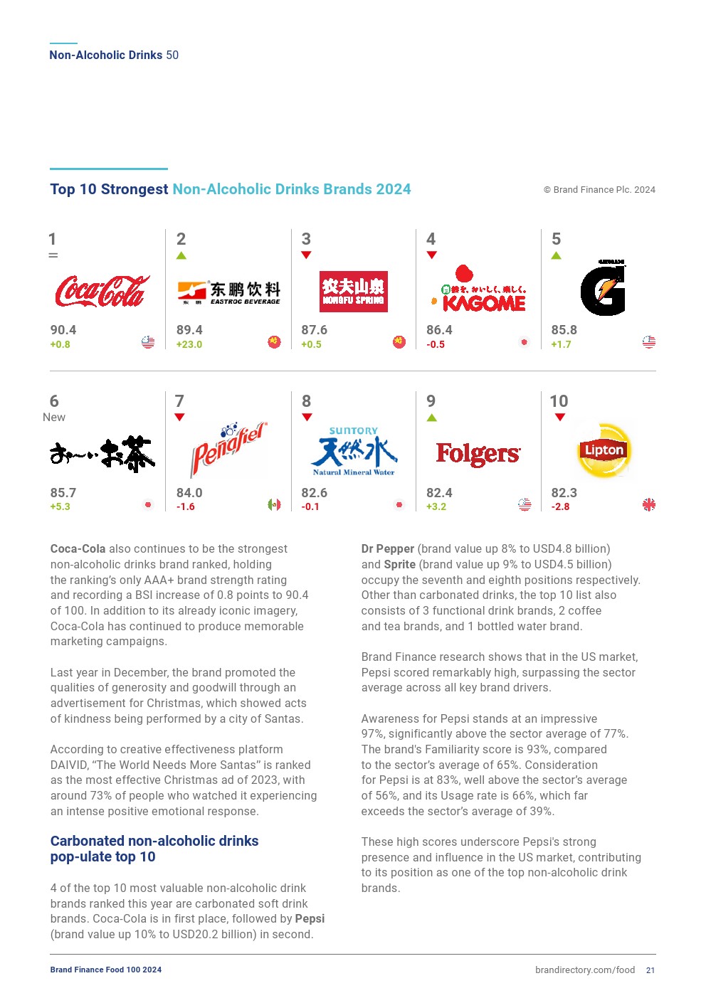 可口可乐仍然是最强大的非酒精饮料品牌,保持着该榜单中唯一的AAA+品牌实力评级,其品牌实力指数(BSI)得分上升了0.8分,达到90.4分(满分为100分)。