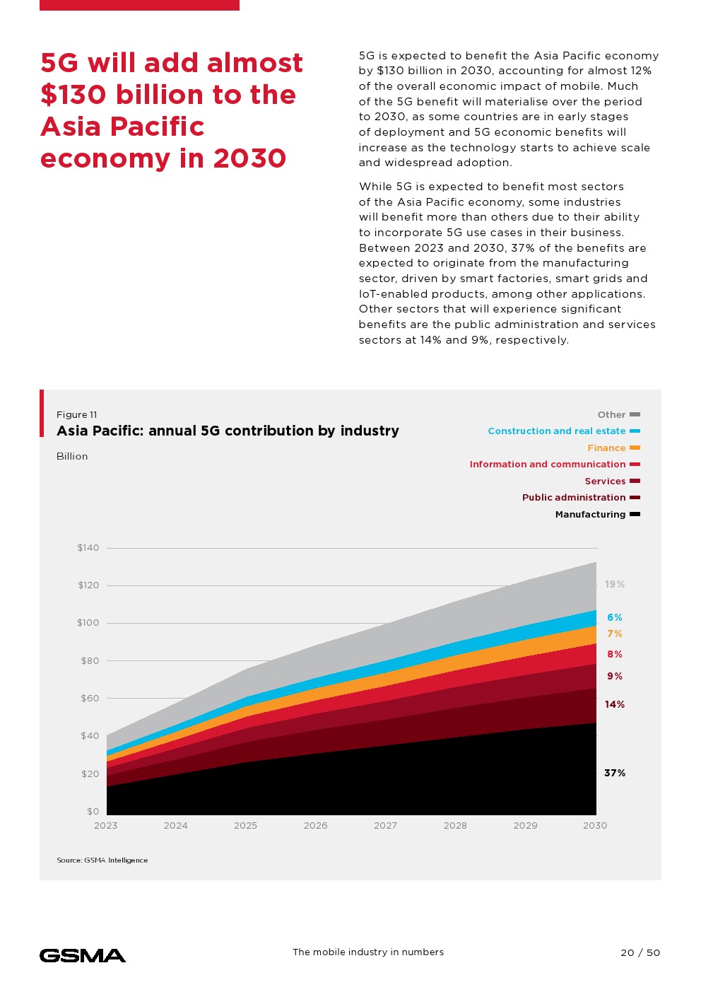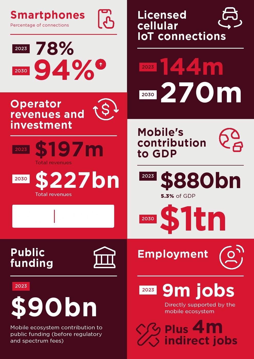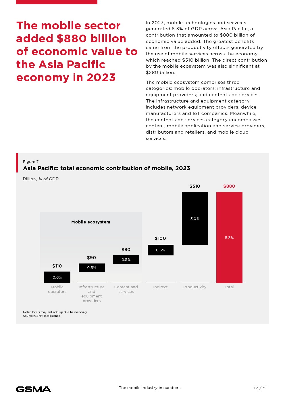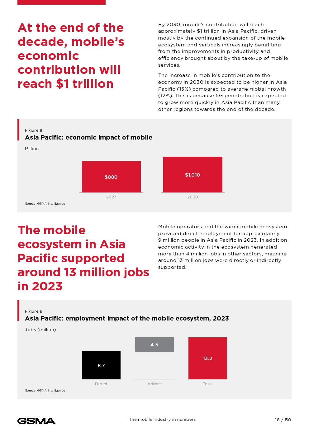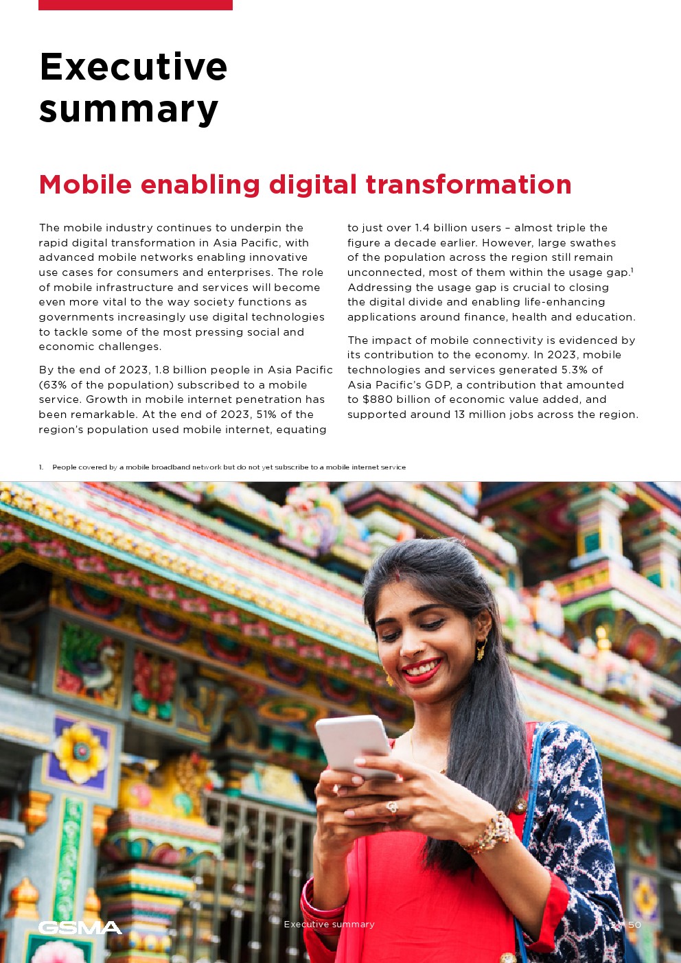 移动连接对经济的贡献证明了它的影响。2023年,移动技术和服务占亚太地区GDP的5.3%,经济增加值达8800亿美元,并为该地区提供约1300万个就业岗位。